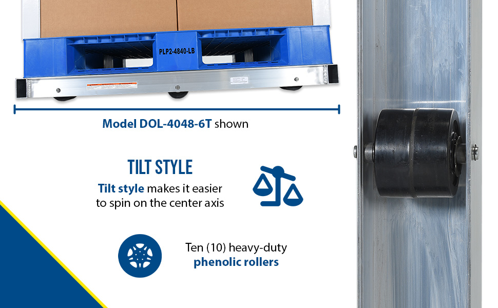 DOL-4048-6T DOL-4048-6TAluminum Pallet Dolly with Tilt 40 In. x 48 In. 4000 Lb. Capacity SilverUniform Static Capacity (lb.): 4,000