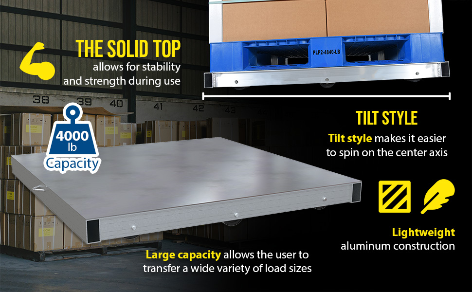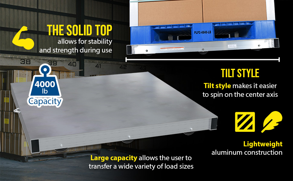 DOL-ST-4848-6T DOL-ST-4848-6TAluminum Pallet Dolly with Solid Top Tilt 48 In. x 48 In. 4000 Lb. Capacity SilverUniform Capacity (lb.): 4000