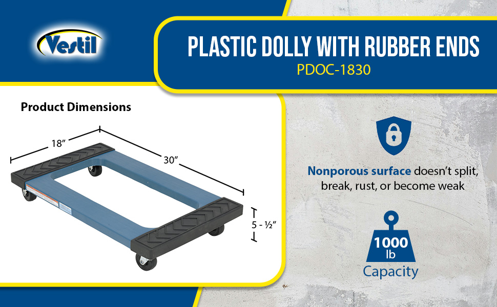 | PDOC-1830 | ![]() | 30 Days Limited Warranty | Plastic Dolly with Rubber Ends 30 In. x 18 In. x 5-1/2 In. 1000 Lb. Capacity Blue | Uniform Static Capacity (lb.): 1,000 Deck Width (in.): 18 | 14 |