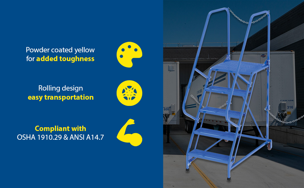 Semi-Trailer Access Ladders are for use getting into Semi-Trailers. Tilt the unit to allow for portability. Units roll on 4" poly-on-poly wheels. Constructed of square tubing framework which handles uniform capacities up to 350 lbs. Features 30" high removable hand railing, access chain, 21" deep top platform, and an industrial baked-in blue powder coat finish for toughness. Each step measures 24" wide by 7" deep and is spaced 10" apart. Climb Angle is 58 degrees. |