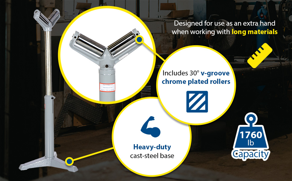 Designed for use as an extra hand when working with long materials. Each stand includes 2" chrome plated rollers and heavy-duty cast-steel base. Choose either v-groove roller design or flat single roller design. The height of each stand is adjusted with a friction lock screw or a gas charged cylinder. Great for use in machine and wood shops. Ships knockdown.