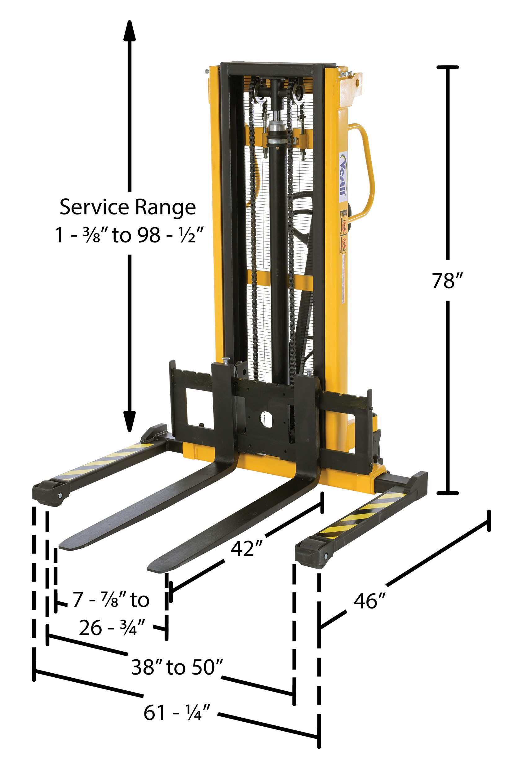 | Steel Manual Stacker Narrow Mast Adjustable Forks/Legs 1,000 Lb. Capacity Black / Yellow | Uniform Capacity (lb.): 1,000 Service Range (in.): 2-1/8 to 62 | 472 |