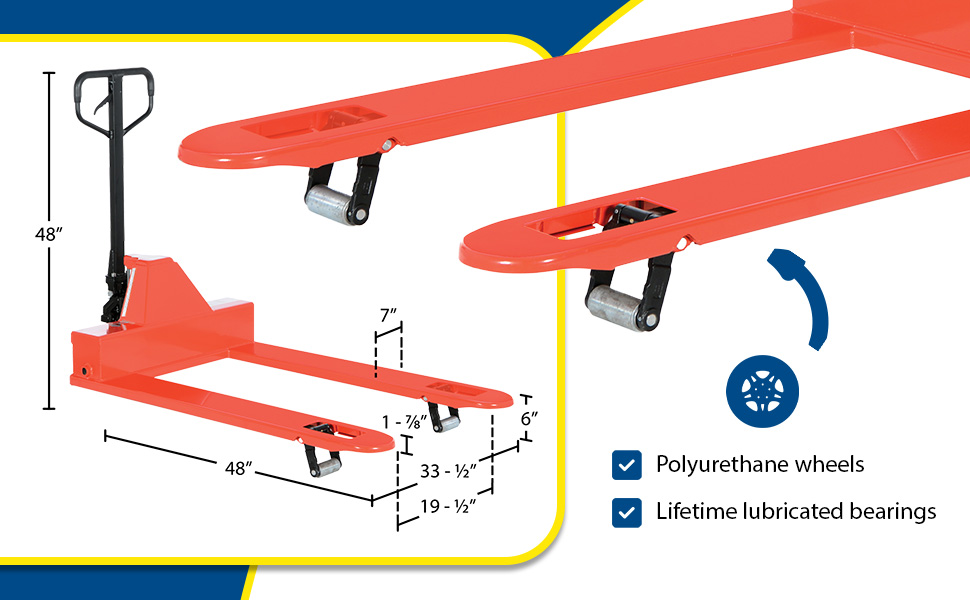 The Low Profile Pallet Truck enters pallets from all four sides. All steel frame is reinforced to handle 4,000 lb. capacity loads. Individual fork width is 7" wide. Wide loop control handle with lift, neutral, and lower functions provides fingertip control. Lifetime lubricated bearings. Hydraulic system has hard chrome plated pump piston with polyurethane seals. Suspension system has a heavy-duty thrust bearing. Complete with adjustable push rods, polyurethane wheels, steel load rollers and red baked-in powder-coated toughness.