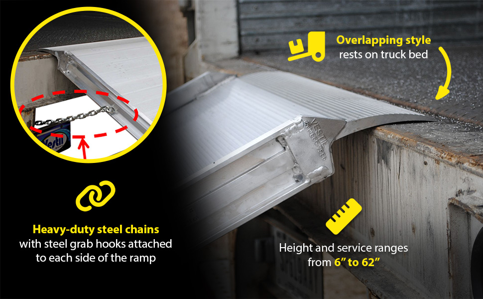 The Aluminum Walk Ramp enables delivery men, shippers, and receivers to load and unload trucks when docks are unavailable. Ramps feature a 1-1/2" high safety curb on each side. Heavy duty steel chains with steel grab hooks are attached to each side of ramp for safely securing ramp to truck. Constructed of strong aluminum alloy with non-skid tread surface. The ramp is lightweight and easy to handle. Available in either an overlapping style that rests on the truck bed, suffix "A", or steel hook style that mounts onto the truck extensions, suffix "B".