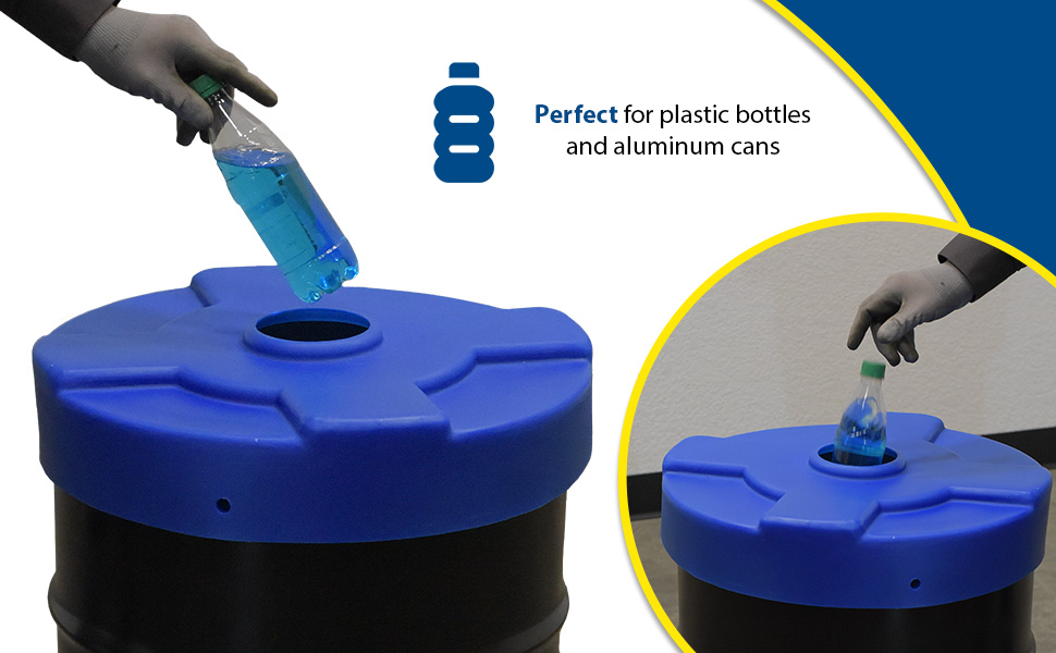 Collecting aluminum cans or plastic bottles could not be easier with Recycling Lids. Fits on open head plastic or steel drums only with lid and ring are removed. Low-density polyethylene construction. Fits snug to resist blowing off in outdoor environments or being tampered with by people or animals. CANF models have a flap to help discourage the removal of contents.