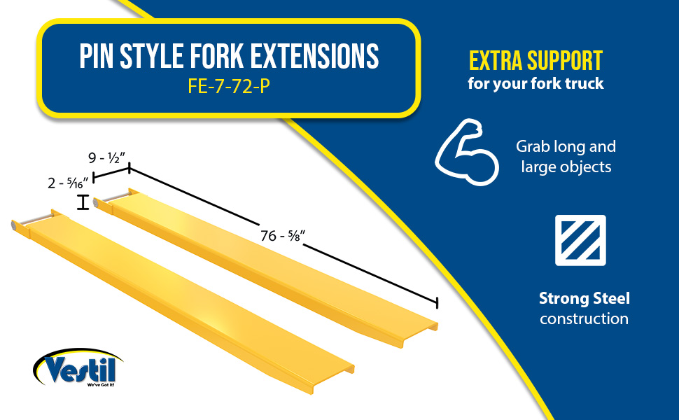 FE-7-72-P FE-7-72-PSteel Pin Style Fork Extensions 7 In. x 72 In. 4,000 Lb. Capacity YellowUniform Capacity Per Pair (lb.): 4,000