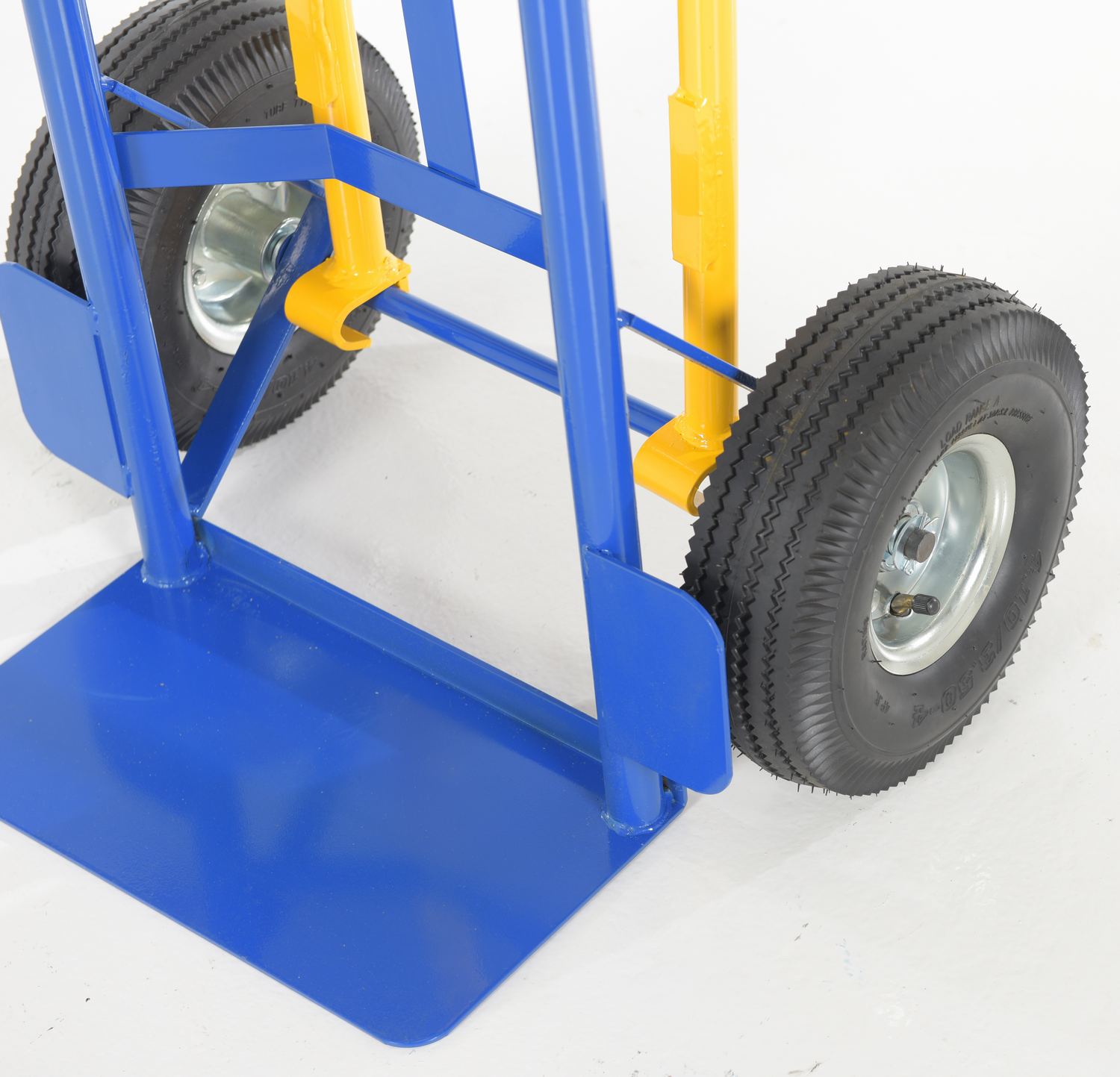 Quick and easy way for two people to transport a loaded hand truck up and down stairways or hills. Easy grip handles provide comfort to persons using hand truck. Removable handles conveniently store on back of hand truck when not in use. Steel construction. 10" x 3-1/2" pneumatic wheels.
