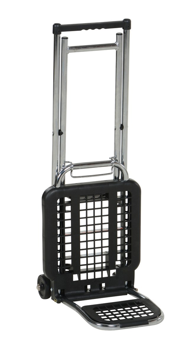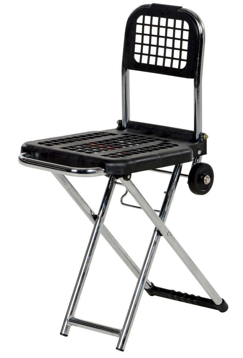 The Multi-Function Luggage Cart/Chair is constructed of both steel and plastic. Cart will handle lightweight uniform loads up to 65 pounds. The chair position holds up to 225 uniform pounds. This Cart/Chair is perfect for use at trade shows for transporting products, literature and small parts. (2) 3" x 3/4" hard rubber wheels are standard.