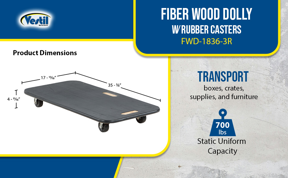 FWD-1836-3R FWD-1836-3RFiber Wood Dolly with Rubber Casters 18 In. x 36 In. 700 Lb. Capacity BlackUniform Capacity (lb.): 700