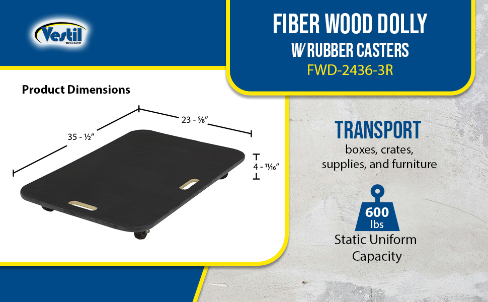 FWD-2436-3R FWD-2436-3RFiber Wood Dolly with Rubber Casters 24 In. x 36 In. 600 Lb. Capacity BlackUniform Capacity (lb.): 600