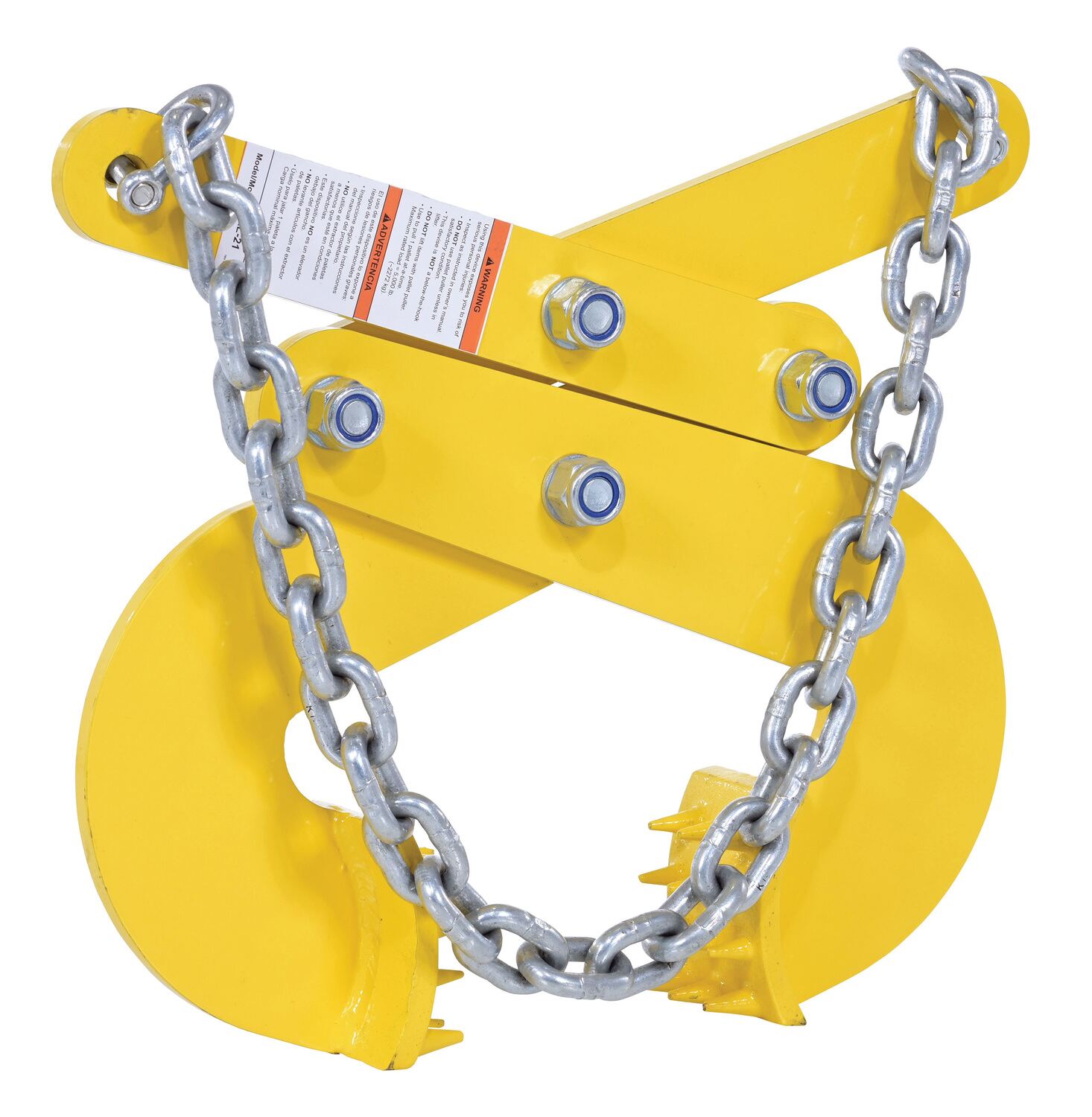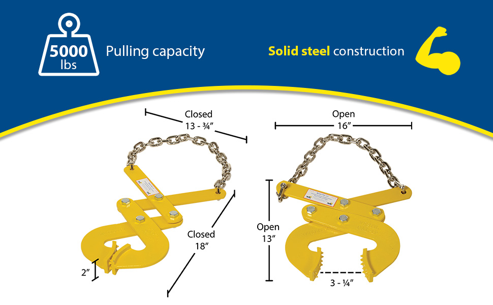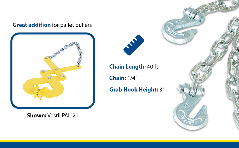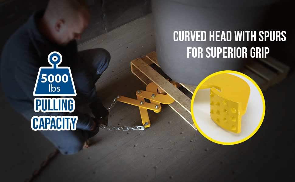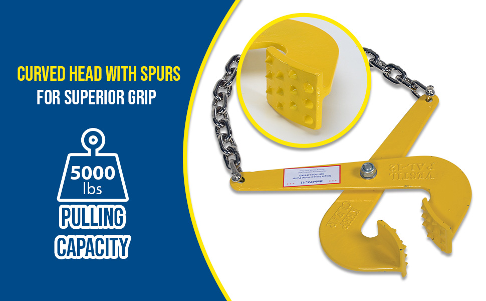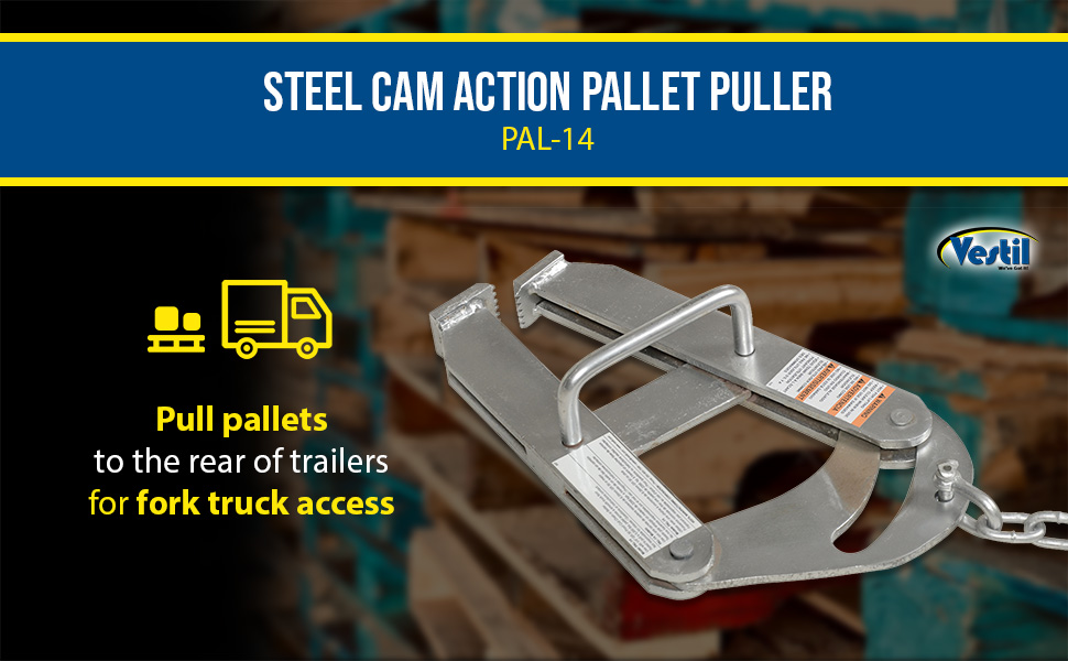 Pallet pullers are used to pull pallets from the rear of trailers, to the front, for easy fork truck access. Rugged steel construction. Heads are self-cleaning and unaffected by wood particles, paint or grease. Pallet pullers and chains are NOT designed for lifting.