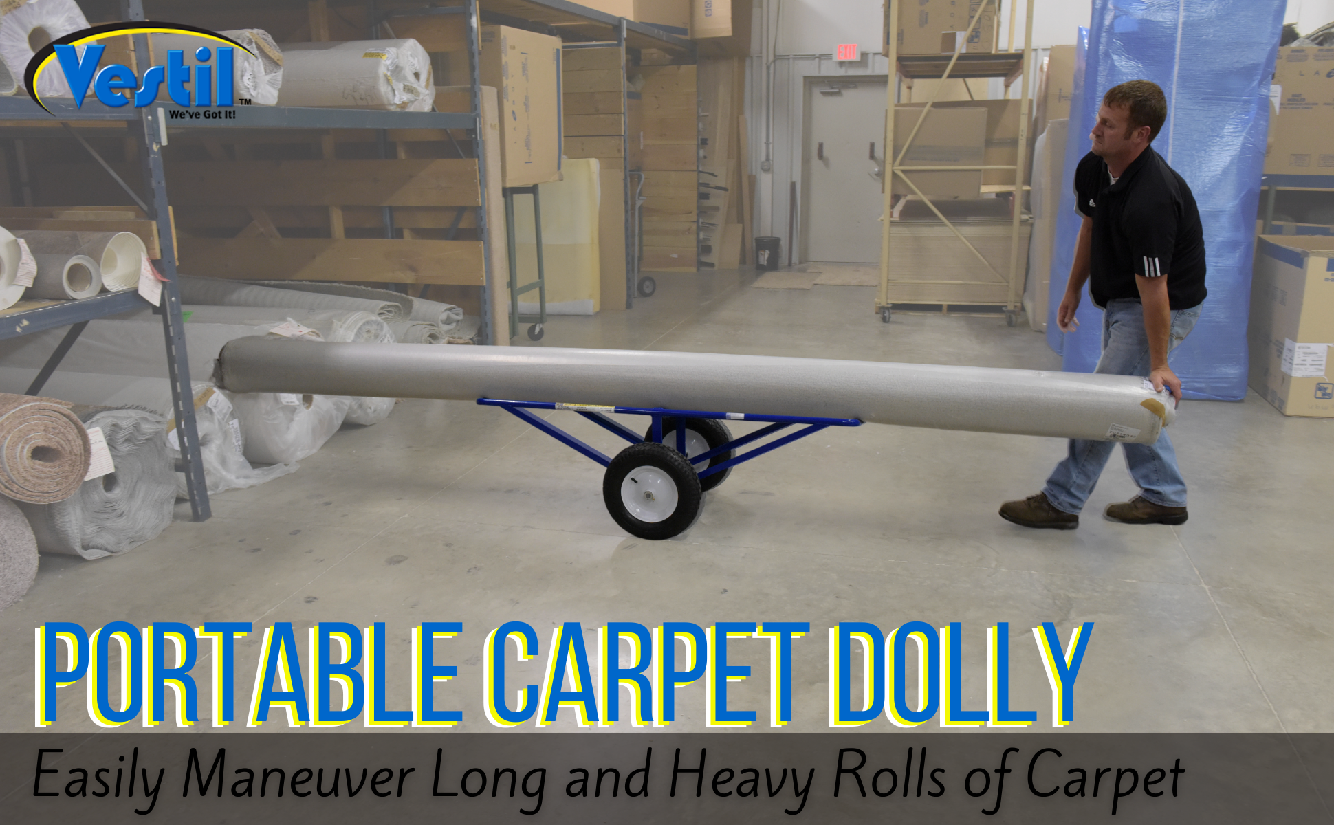 Portable Carpet Dollies allows for easy movement of long and heavy rolls of carpeting. V-groove platform holds carpet rolls securely in place.