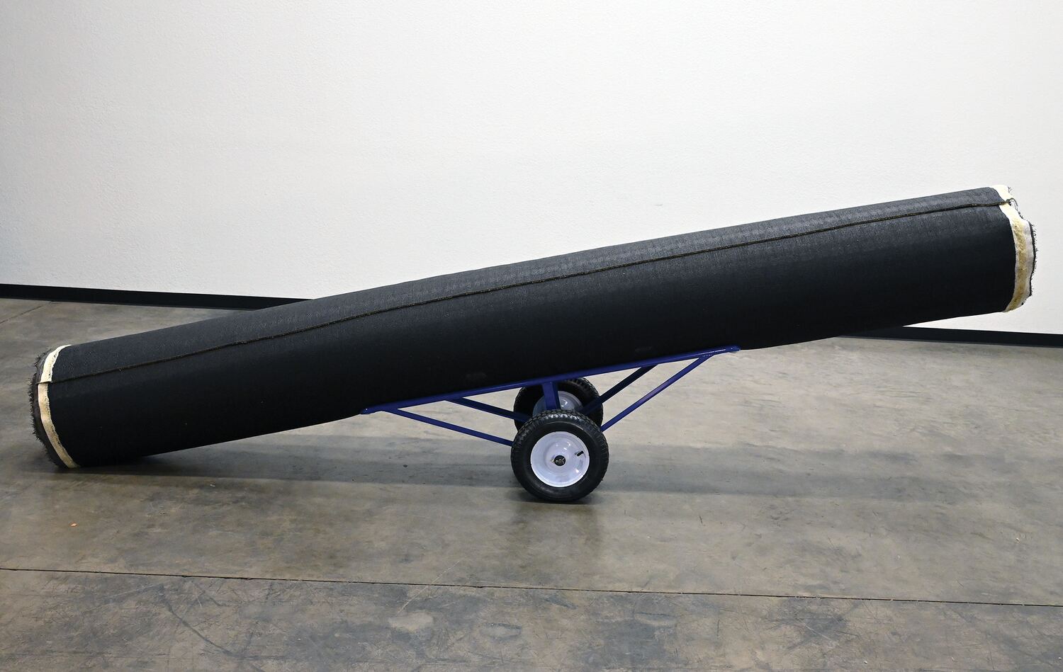 Carpet Dispenser minimize lifting and pulling. Slide carpet onto rollers. Carpet unrolls as needed. Retractable legs stabilize cart.