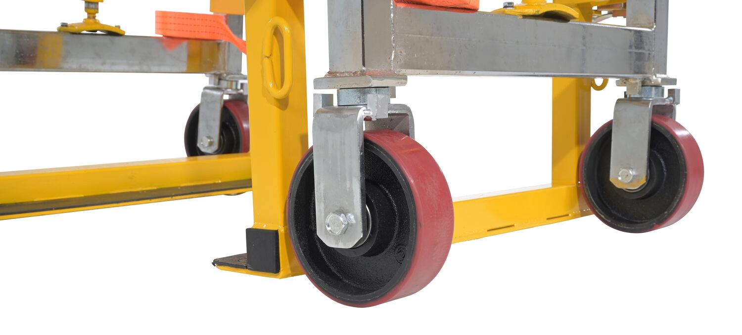 Transport furniture, crates, and vending machines easily. Simply slide nose plate under item to be moved, strap both dollies together, and lift. Available in either a manual mechanical hand crank lift option or a manual hand pump hydraulic lift option. Standard with (4) 6" x 2" swivel poly-on-steel casters and 190" long straps. Steel construction with durable paint finish. Priced and sold in pairs.