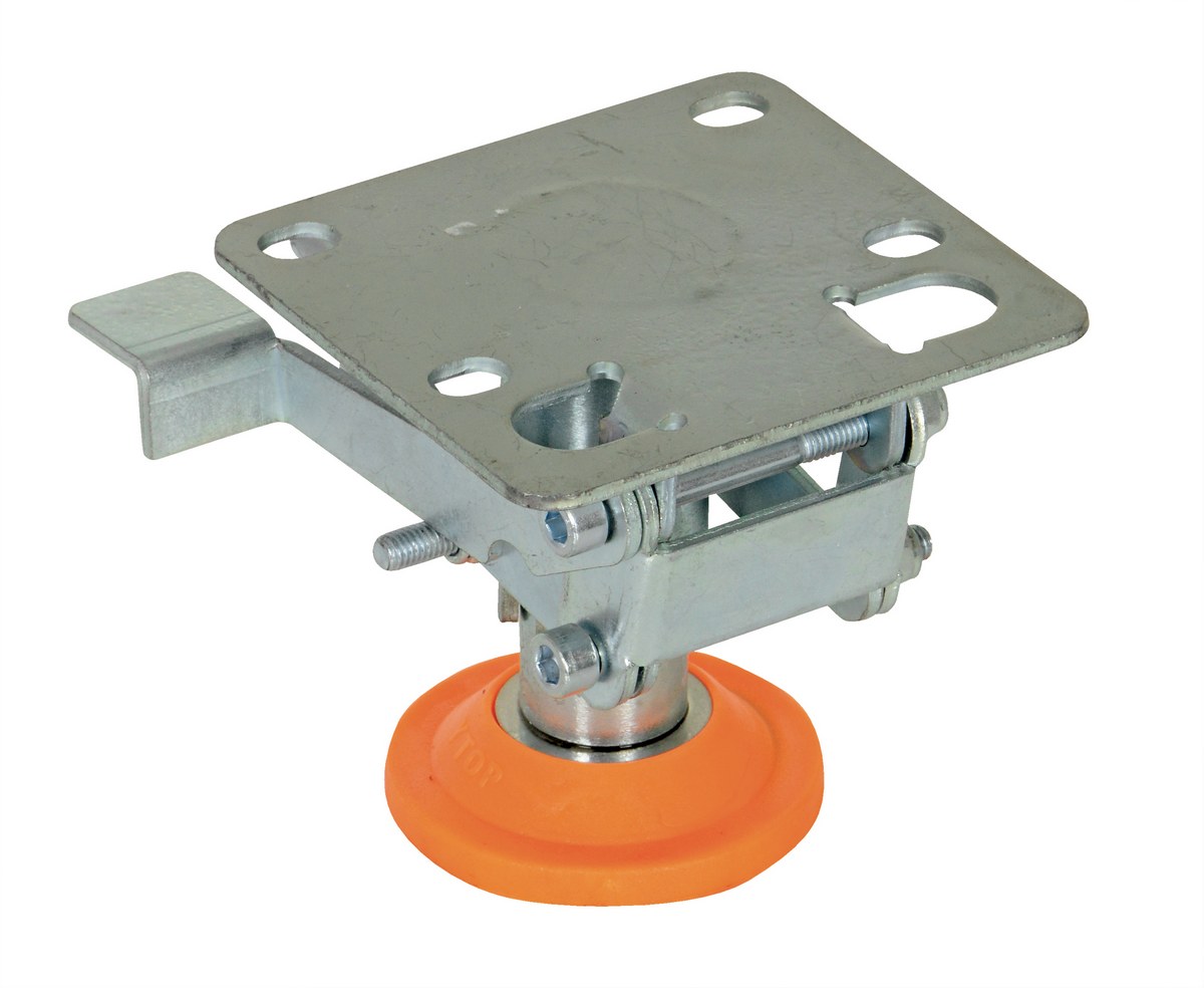 Floor Locks are ideal for maintenance and construction facilities. The unit is designed to create a stable environment, while decreasing the chance of jostling or slight movement. The unit is constructed of steel with a thermoplastic polyurethane base. To use, place the unit close to a desired wheel or caster and raise until tension is built. Once secured, a simple locking device can be activated by applying pressure to the foot pedal.