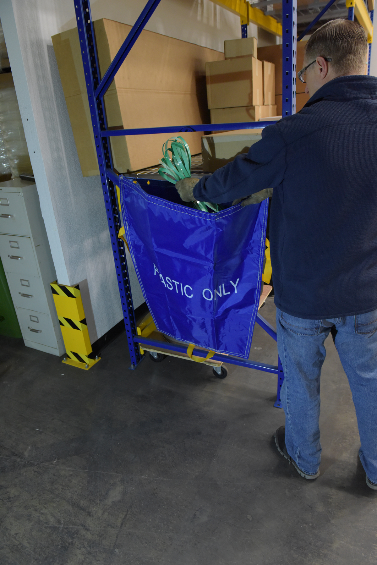 Control warehouse waste without using valuable floor space! Manufactured from rugged, black, waterproof polyester material, the unit has three handles to help with emptying. "S" hooks are included for hanging the bag on pallet rack end frames.