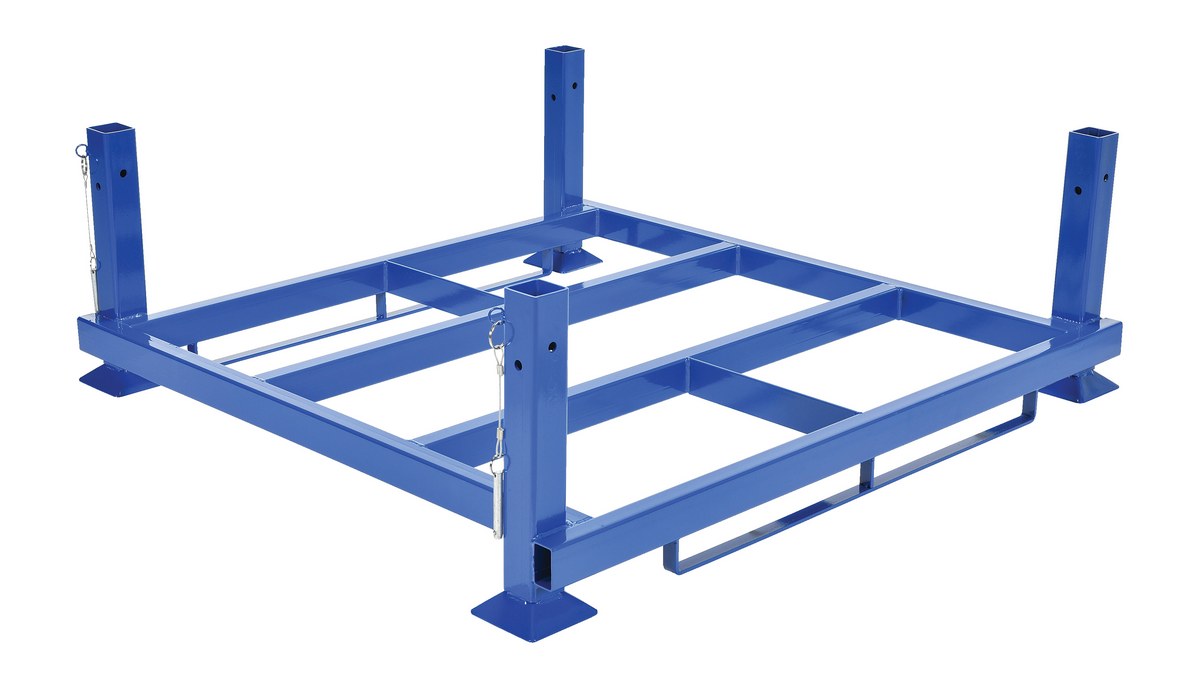 Unique transport and storage racks will stack and nest for maximum versatility. Remove or change post height depending on application. All heights noted are for load heights. Each unit features a uniform capacity of 4,000 pounds. Design allows for stacking up to two (2) units high. Solid steel deck construction. Rugged welded steel construction with blue, baked-in powder-coat finish for added toughness. Large target and pintle for speedy alignment. Units are available with fork lift pockets, solid decking and caster kits upon request.