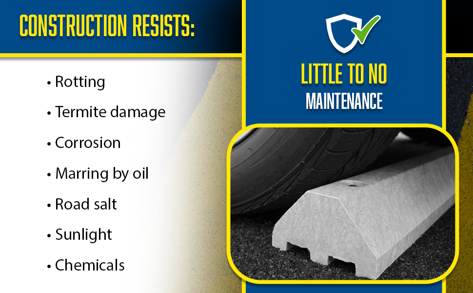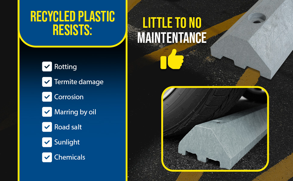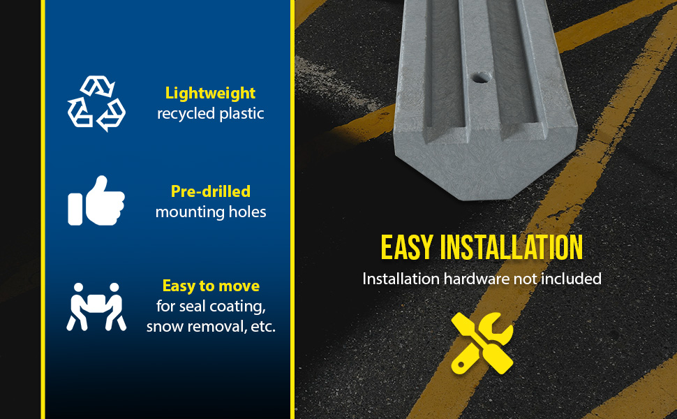 Protect people and property from drivers in dangerous areas. Constructed of lightweight recycled plastic. One person installation. Can be removed for seal coating, snow removal, or change of location. Resists marring by oil, road salt, sunlight, and chemicals. Resists rotting, termite damage, and corrosion. No costly painting or maintenance. High-visibility color enhances driver and pedestrian safety. Mounting holes are pre-drilled for a quick installation process. Hardware kits are available separately.