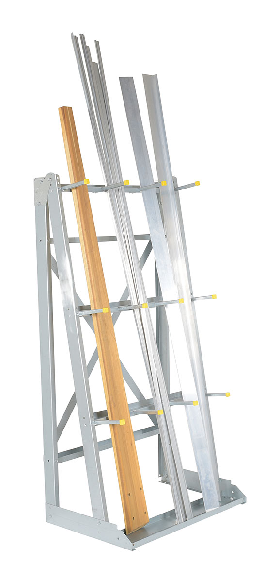 Model SR-V is a floor-mounted vertical material rack. Features three storage bays. Shipped knocked down with convenient and quick assembly. Bright zinc plated finish.