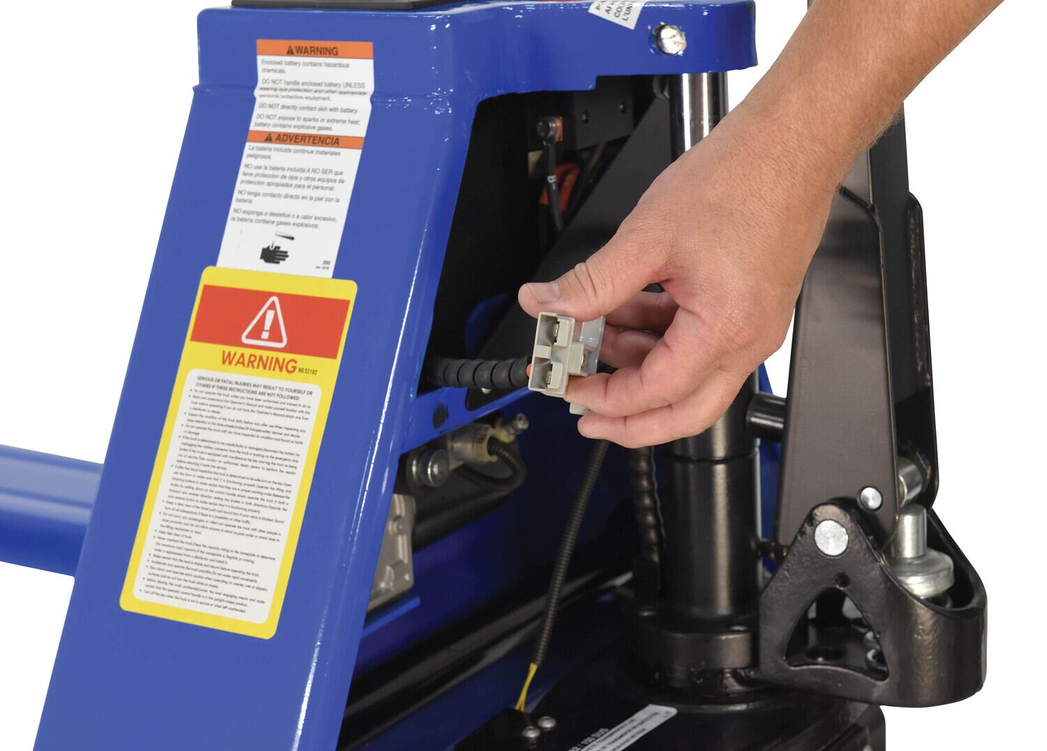 • Multi-function ergonomic handle with emergency reverse, battery indicator, raise/lower buttons, horn, and forward/reverse butterfly switch.