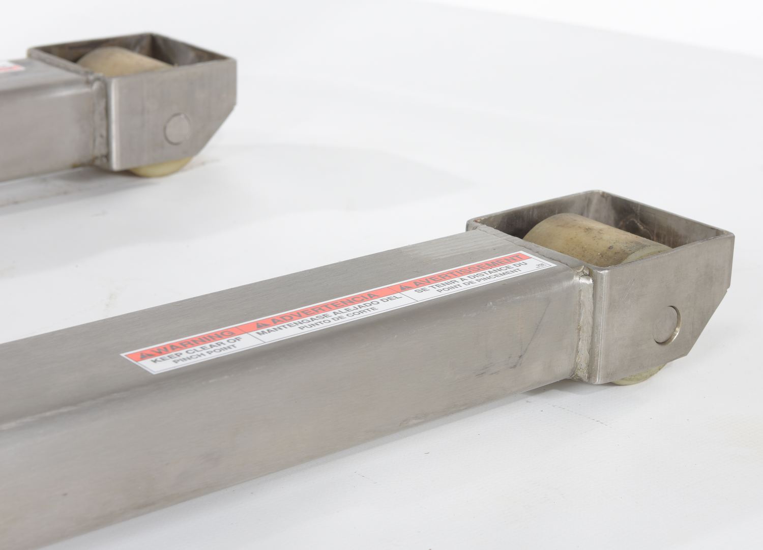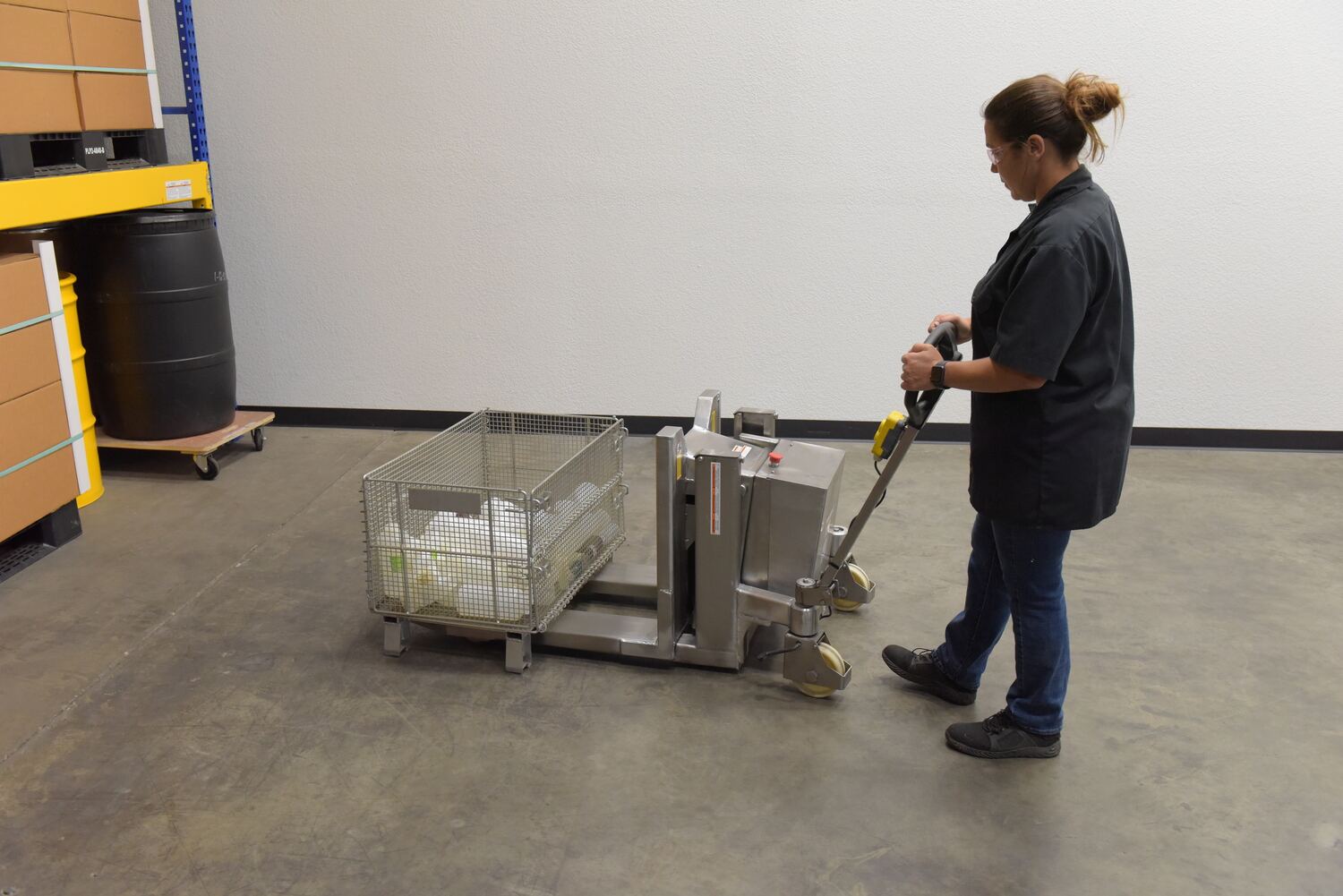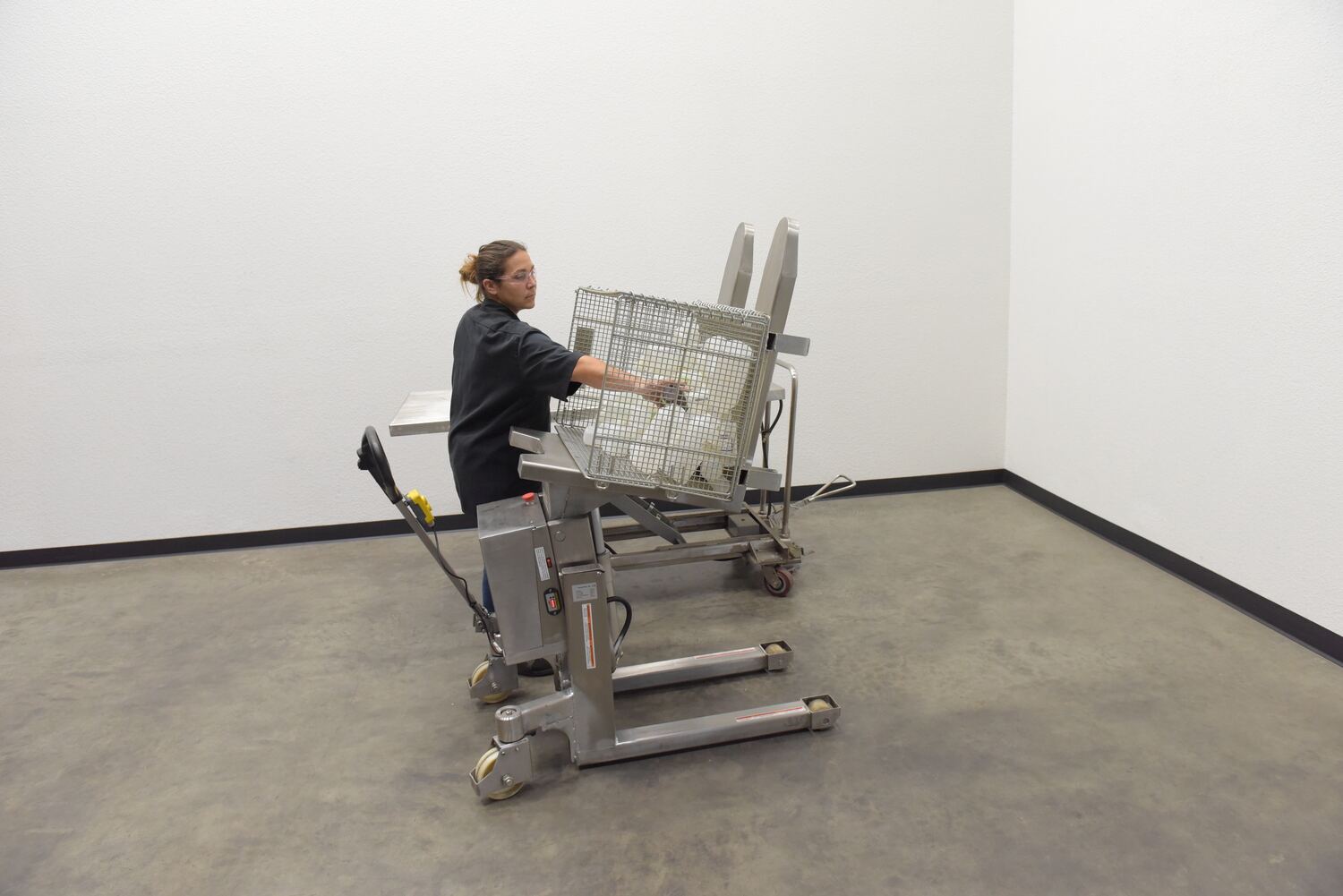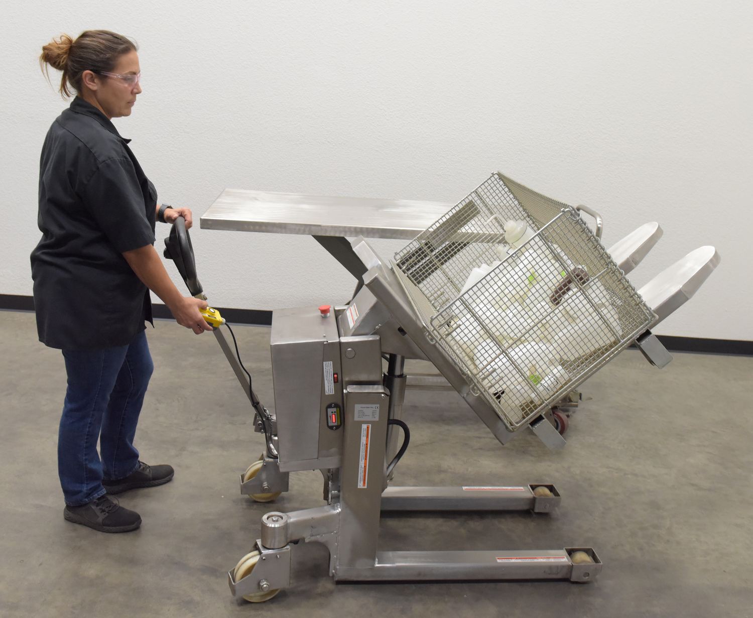 The battery operated electric lifter and tilter is designed to give the user an ergonomically correct position to reach loads easily without the need for bending down or excessively reaching over. Lift, tilt and transport crates, boxes, and pallets with an open bottom. Forks can be tilted to 90 degrees. Rolls smoothly on 6" x 2" nylon swivel casters with brake and foot protectors. Width between forks is 9-1/2". The overall fork width is 22". The individual fork width is 6-1/4". Handle can be turned and locked in position away for the work area. Features include hand control for the tilt and emergency on/off switch. 12V battery and external battery charger included. The stainless steel constructed version provides strength and durability throughout a lifetime of daily use.