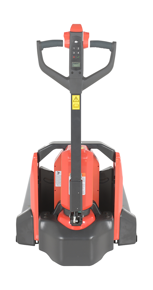 - Multi-function handle with integrated PIN code LCD display, emergency reverse, raise-lower buttons, horn, turtle speed button, and foward-reverse butterfly knobs.