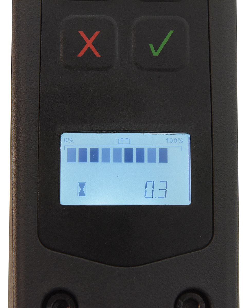 - LCD display features battery charge indicator, operating hour counter, and on-board diagnostic via error code.