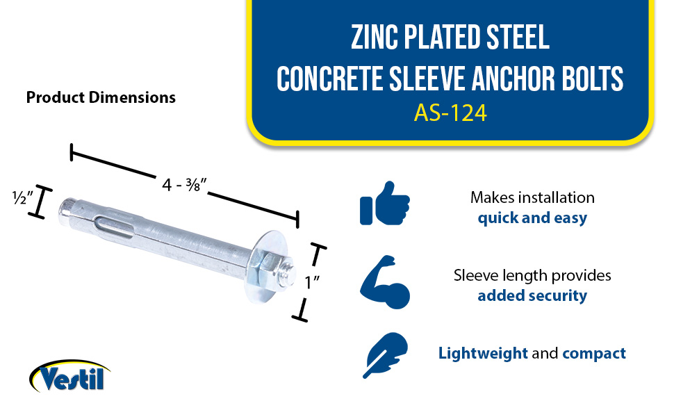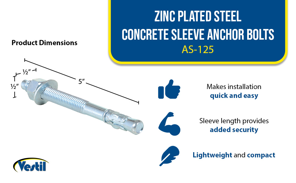| Steel Concrete Sleeve Anchor Bolts 12 Pack 1/2 In. x 5 In. Silver | Pack (qty.): 12 Sleeve Length (in.): 3 | 6 |