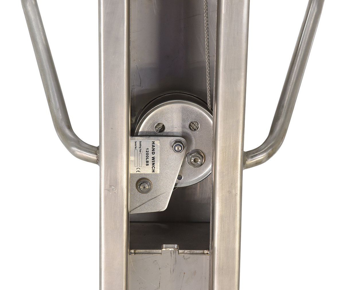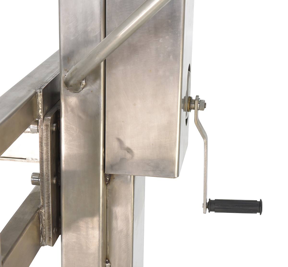 If a meat buggy makes moving items easy, then the meat buggy lifter/transporter makes moving large quantities even easier. The straddling dual arms of the lifter help secure the unit in place. Once in place, the user can utilize the hand winch to lift or lower the buggy to the desired height. For transporting, the unit rolls smoothly on casters, while the upright driving handles help steadily steer. Stainless steel open design is simple to wash-down and clean after use.
