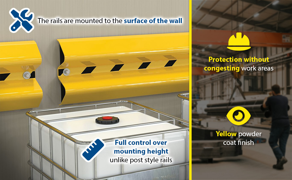 A Wall Mounted Bumper Rail provides the safety and structural security that all industries need. The rails are mounted to the surface of the wall, providing essential protection without congesting work areas. Unlike post style rails, the wall mounting capabilities give the user full control over the height at which it is mounted.