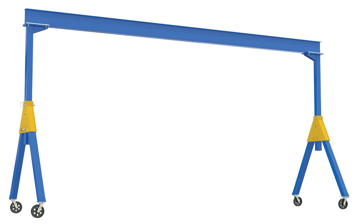 The fixed height knockdown industrial steel Gantry cranes are uniquely designed to be disassembled when not in use for compact storage and easier transportation / shipping from one job site to another. Facilitate easy mobility from one area to another with the standard four (4) V-groove casters. These allow for quick movement and positioning adjustments. Features quick setup design. Do not move units while loaded. Painted blue finish. Designed for semi-permanent or permanent applications. Requires assistance from fork truck to set-up. Do not move units while loaded unless using V-Groove Caster and Track Option. Hoists & Trollies can be ordered seperately.