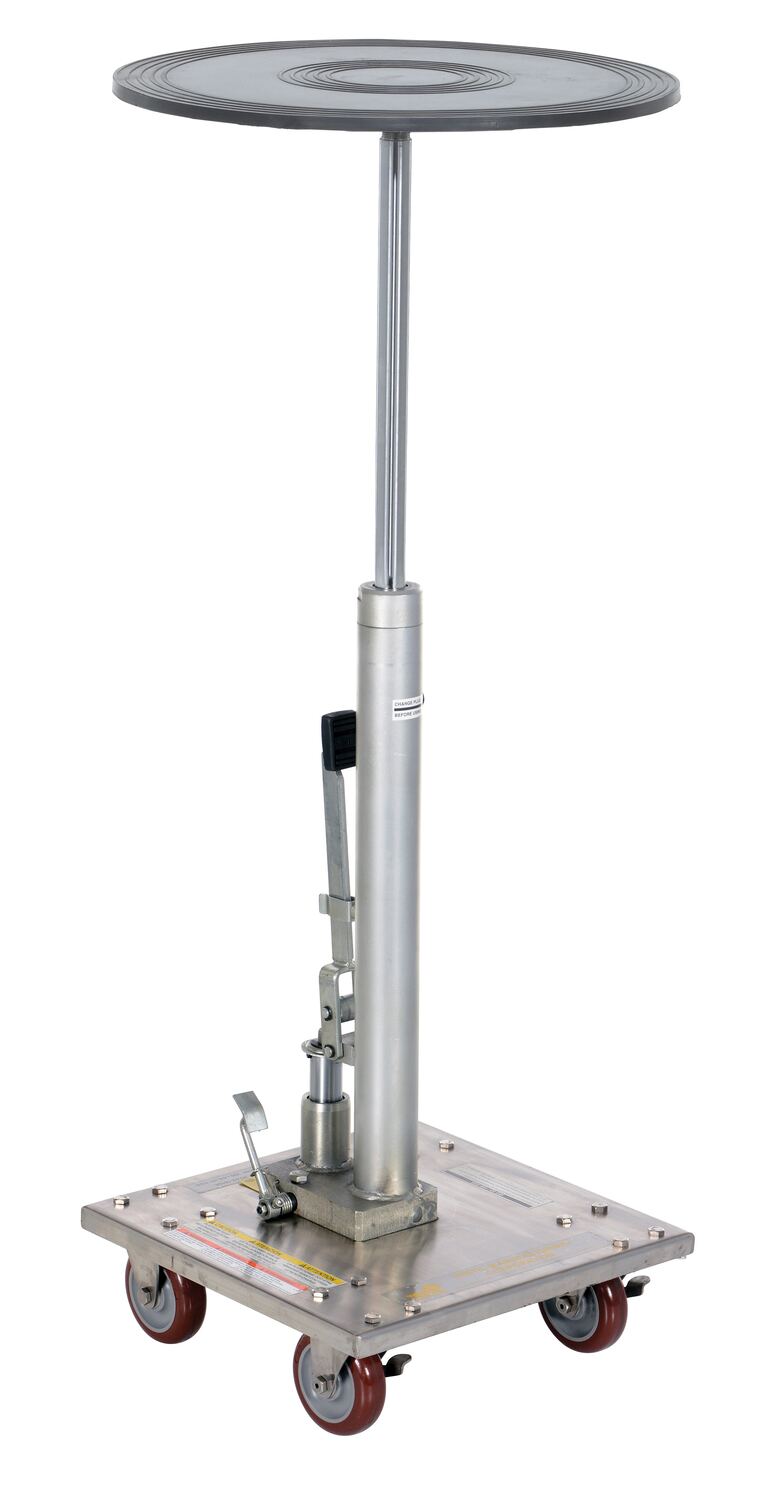 A hydraulic post table works well in a variety of environments; from raising dies and castings to moving machine parts. The round top makes the post table easily accessable from all sides while the adjustable height allows the user to raise the table up to an ergonomic working height. The table rolls on two swivel and two rigid casters. Brakes are included on the casters to help maintain stability during the loading and unloading process. Steel units with a blue powder coat finish and partially stainless steel (-PSS) are available.