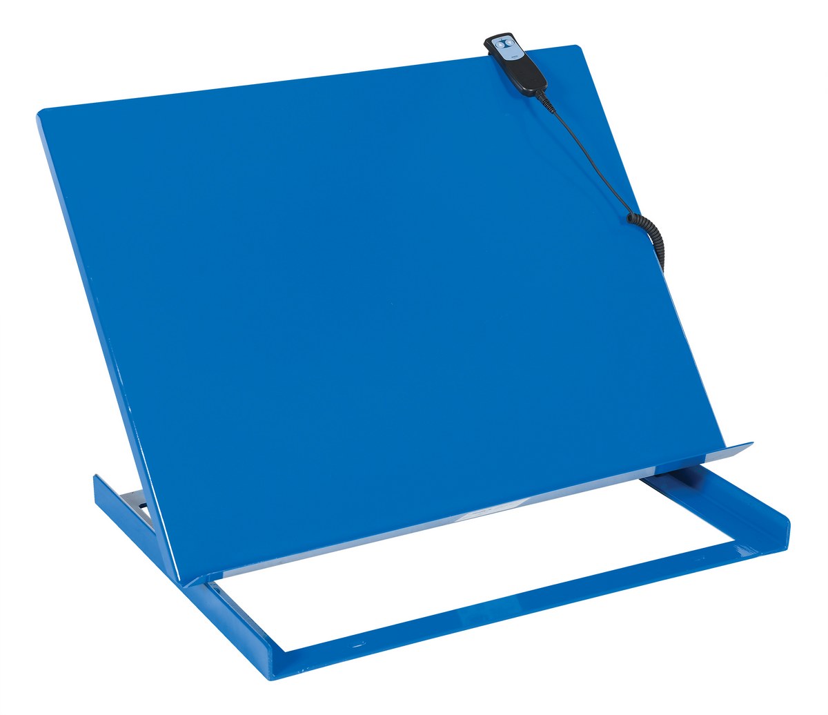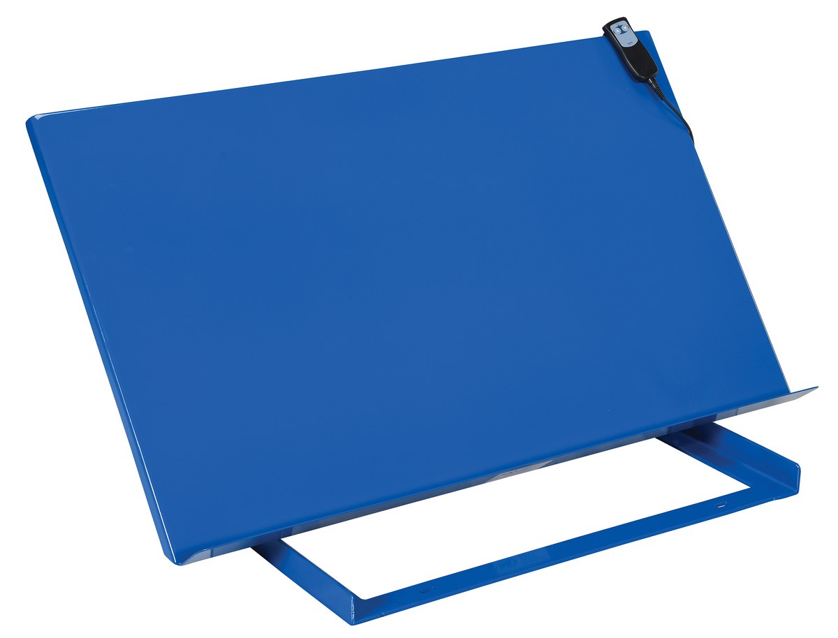 Bench Top Tilters increase efficiency and help reduce fatigue and potential injury by placing work at a better ergonomic angle. Loads up to 1,000 pounds may be tilted from 0 degrees to 45 degrees. Heavy-duty steel Bench Top Tilters can be attached to most industrial table tops, work benches and mobile lift tables of sufficient load capacity and surface size. Pendent hand control with UP and DOWN push buttons is located on an 8 foot cord, maximizing operator convenience. Flat base plate with slotted holes for installation. Units are colored royal blue.