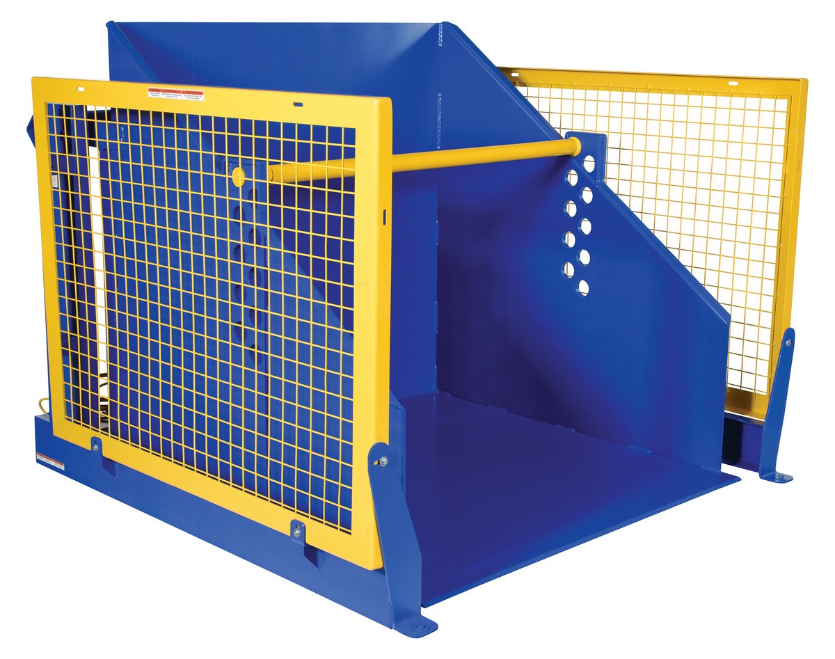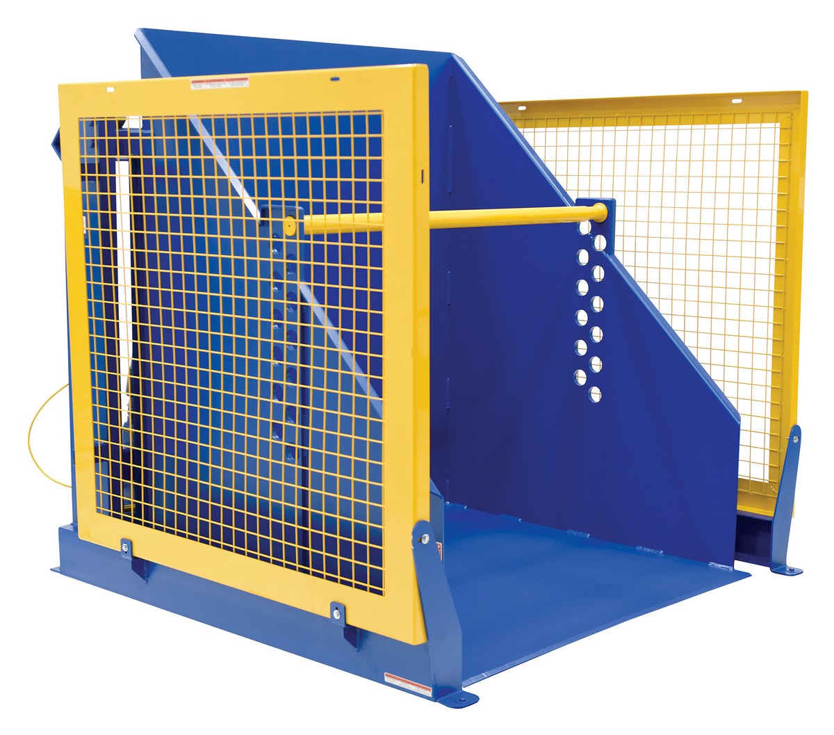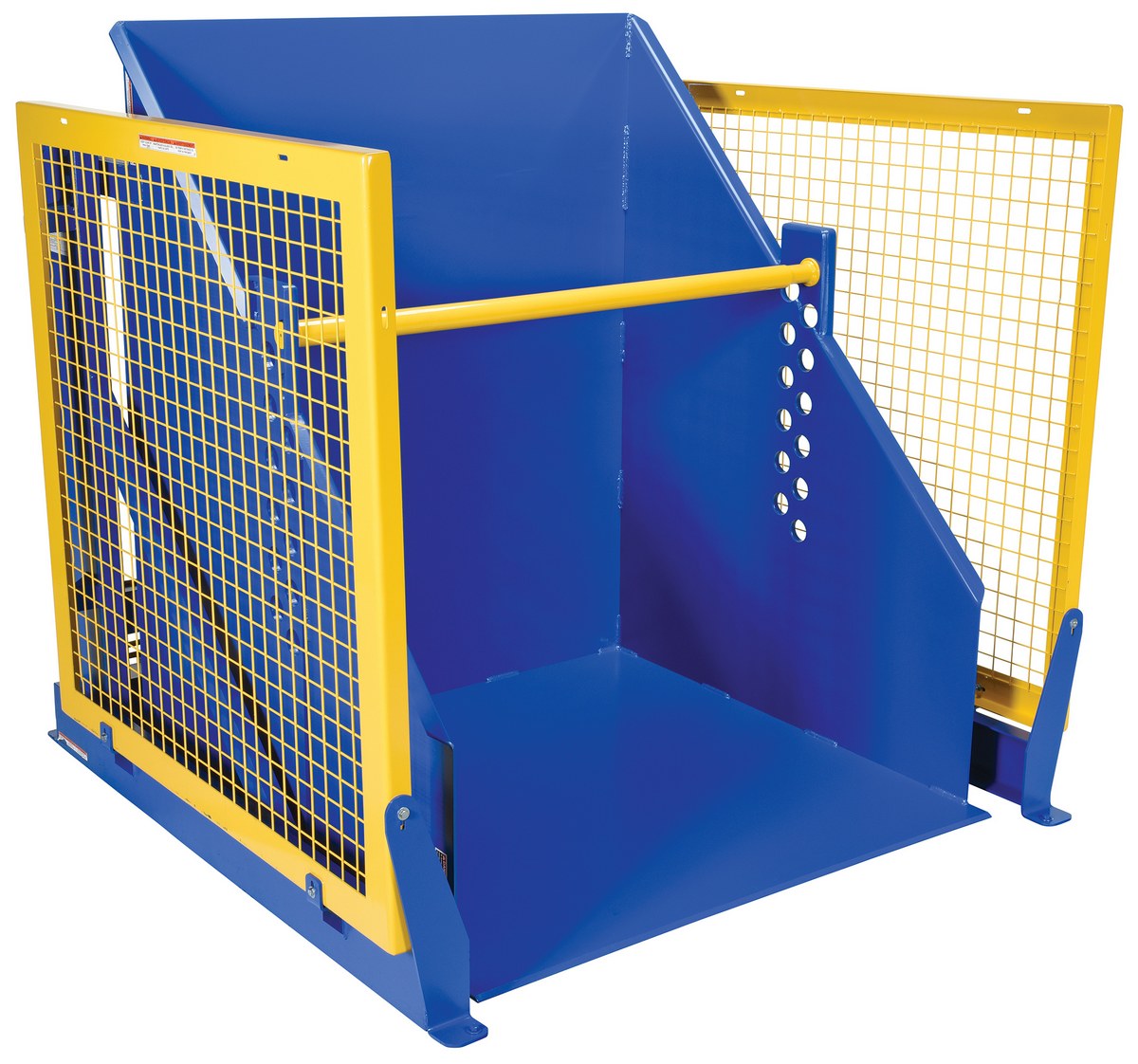 Designed for controlled dumping of material from boxes, crates, and other types of containers. Lowered height of only 3/8" allows for pallet truck loading and unloading. Retaining bar adjusts every 2" to accommodate a wide range of container heights. Each dump height has a hold down range, see chart. Maximum rotation is 135 degrees yielding a 45 degree dump angle. Unit may be stopped at any point during the dump cycle. Chute reach is 10" when fully rotated. Internal 2HP power unit and hand held control standard (5.5 HP power unit on 6,000 pound models). Protective mesh side screens included. Heavy-duty welded steel construction. Standard duty cycle equals maximum 15 starts per hour in a normal environment. Duty cycle is calculated by starts per hour or number of times "up" button is pushed. Jogging (bouncing of the chute) is NOT recommended.