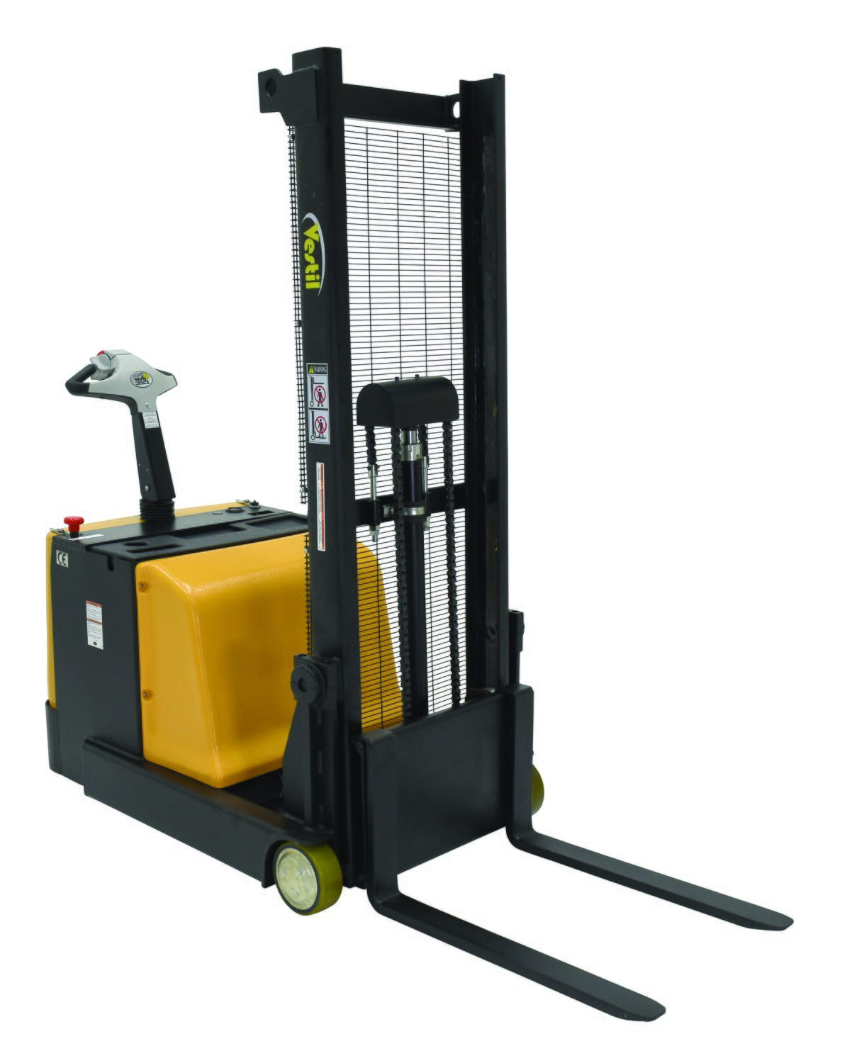Counter balance design is ideal for die loading, machine feeding, and for loading and unloading trucks. High torque 24VDC drive and lift motor handles heavy-duty jobs. Ergonomic handle features easy-to-operate throttle with infinite adjustment of forward and reverse speeds, lift/lower controls, proprietary safety-enhancing emergency reverse function, and horn. Includes an electromagnetic disc brake with automatic dead-man feature that activates when the user releases, the handle. Powered lift has four 6V batteries (except S-CB-62 & S-CB-118, which uses two 12V batteries), an integral battery charger, and battery level gauge. Stacker rolls smoothly on poly-on-steel steer & load wheels. Features 0.7 KW drive and 2.0 KW lift motor. 3-4 hour operation at full charge - 8 hours when used intermittently. Adjustable forks suitable for different pallets. Individual forks are 3⅛" wide on series S-CB and 4" on series S-2CB. Overall size is 32."W x 78"L on series S-CB and 35."W x 110"L on series S-2CB A high level of serviceability simplifies maintenance and prolongs equipment life. Easy access battery compartment simplifies battery maintenance.