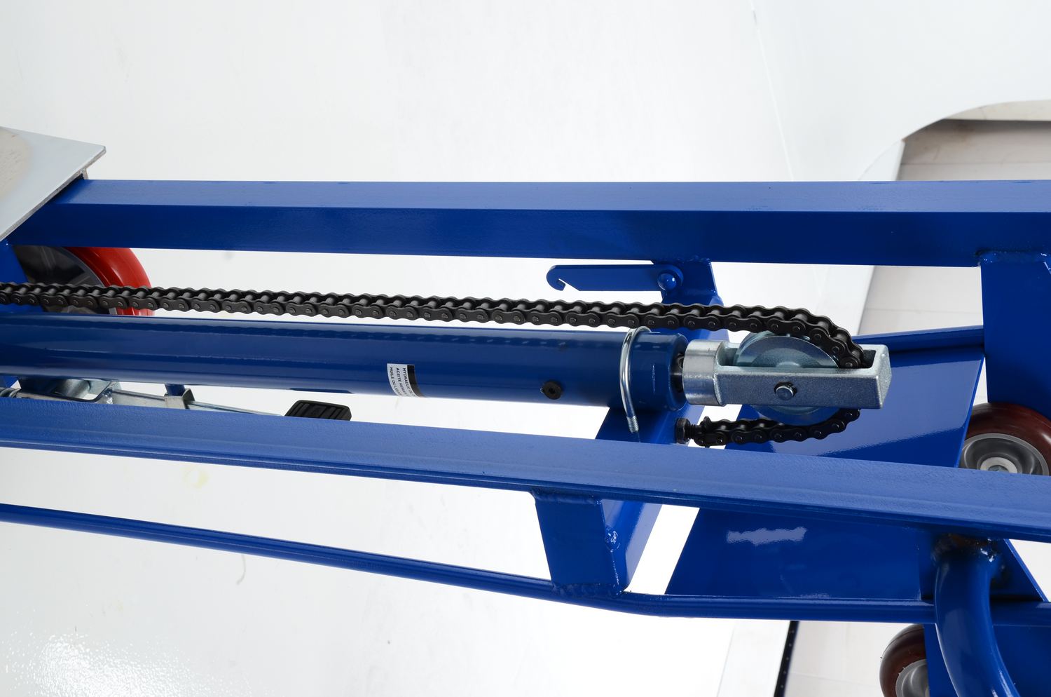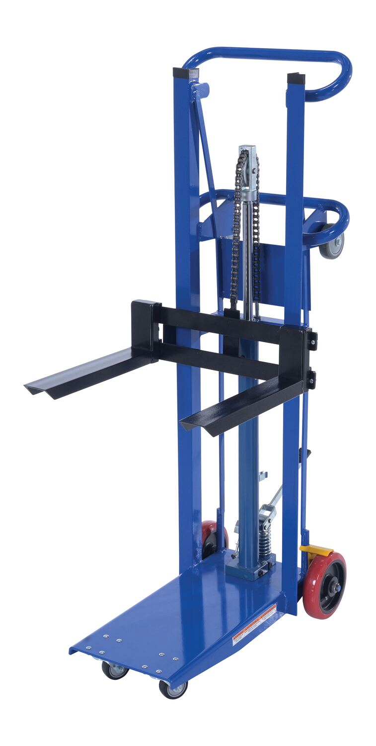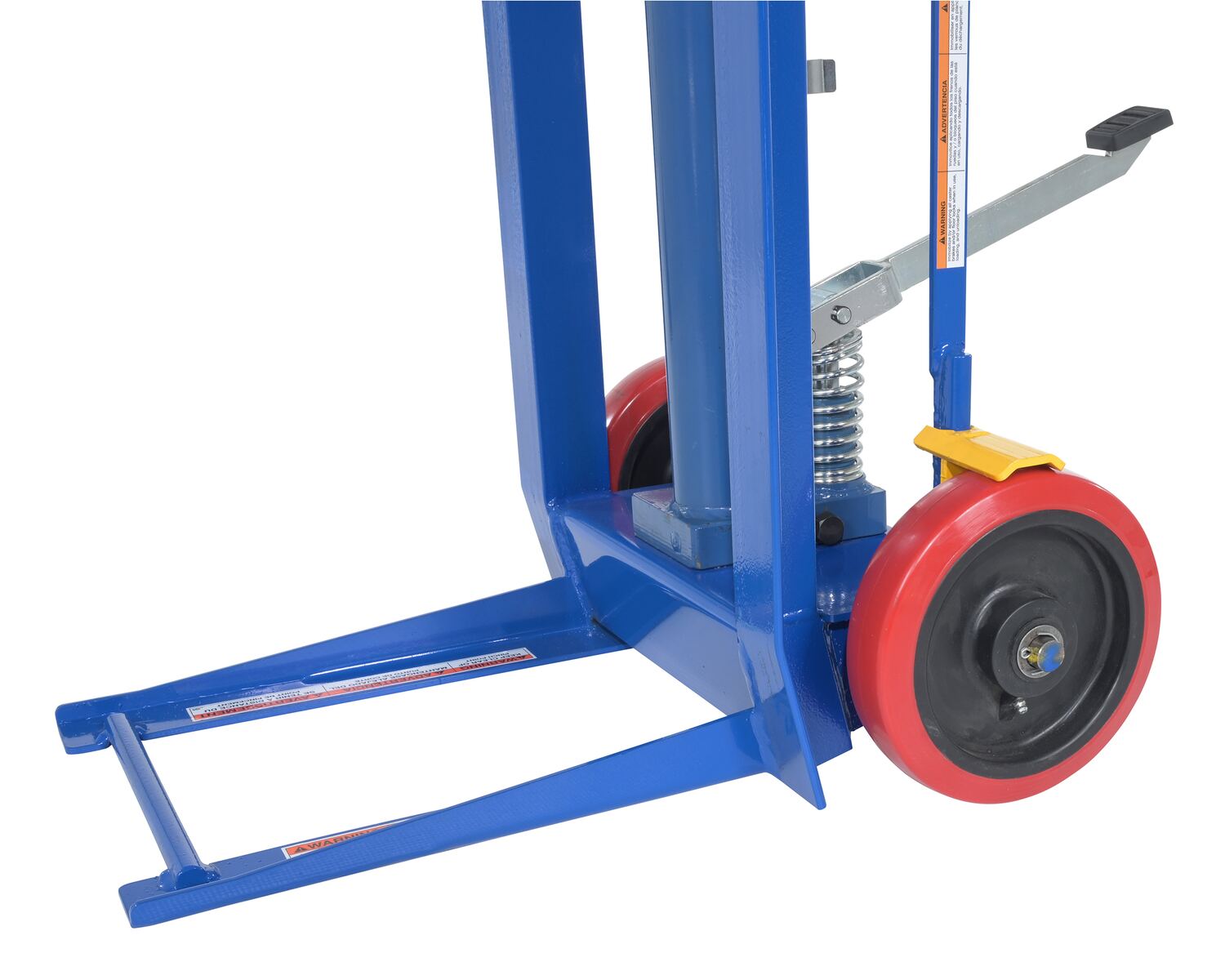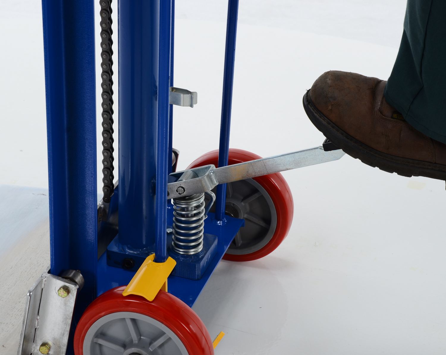 Transport loads in the lowered position and maneuver work materials to an ergonomic height. Ideal in compact work areas. Safe and easy one person handling of loads up to 1,000 lbs. An efficient way to unload heavy objects from semi trailers. Rugged steel construction for years of service. Dependable precision built hydraulic system is activated by easy action foot lever. Additional rollers on the handle make loading into a delivery truck easy. Steel construction. Approximately 1" of lift per pump. Models HYDRA-2 & HYDRA-4 come standard with a single wheel brake. HYDRA-HD has (2) two swivel casters with brakes. Baked-in powder coat finish for toughness.