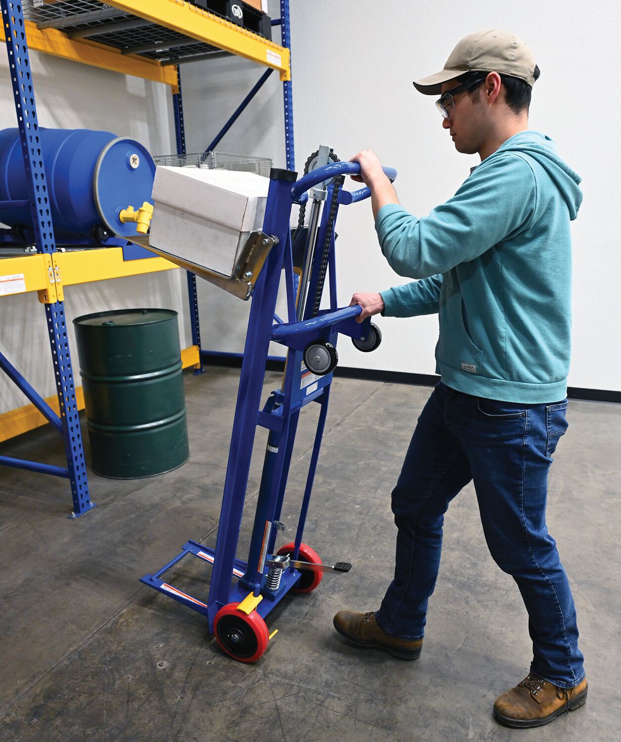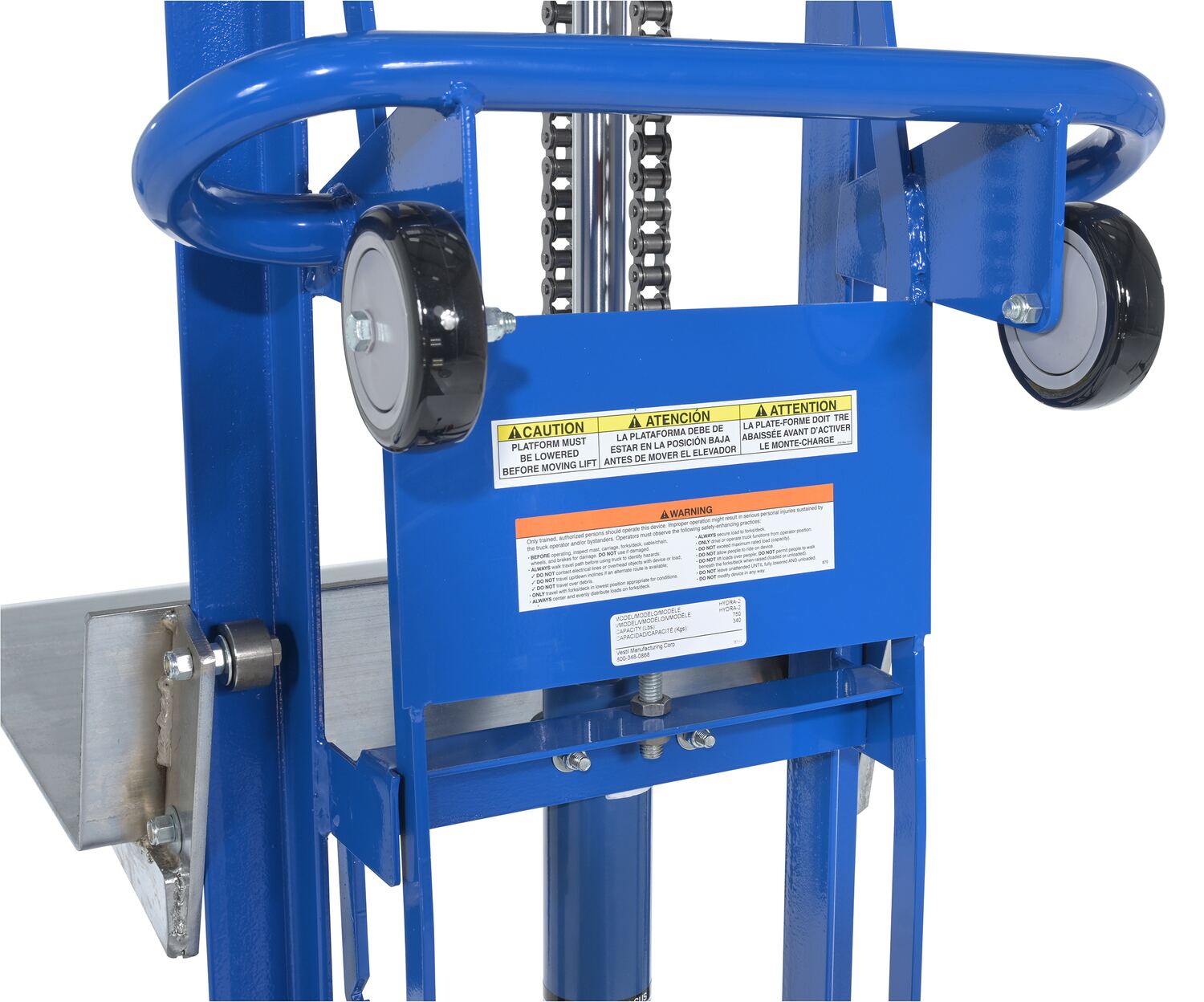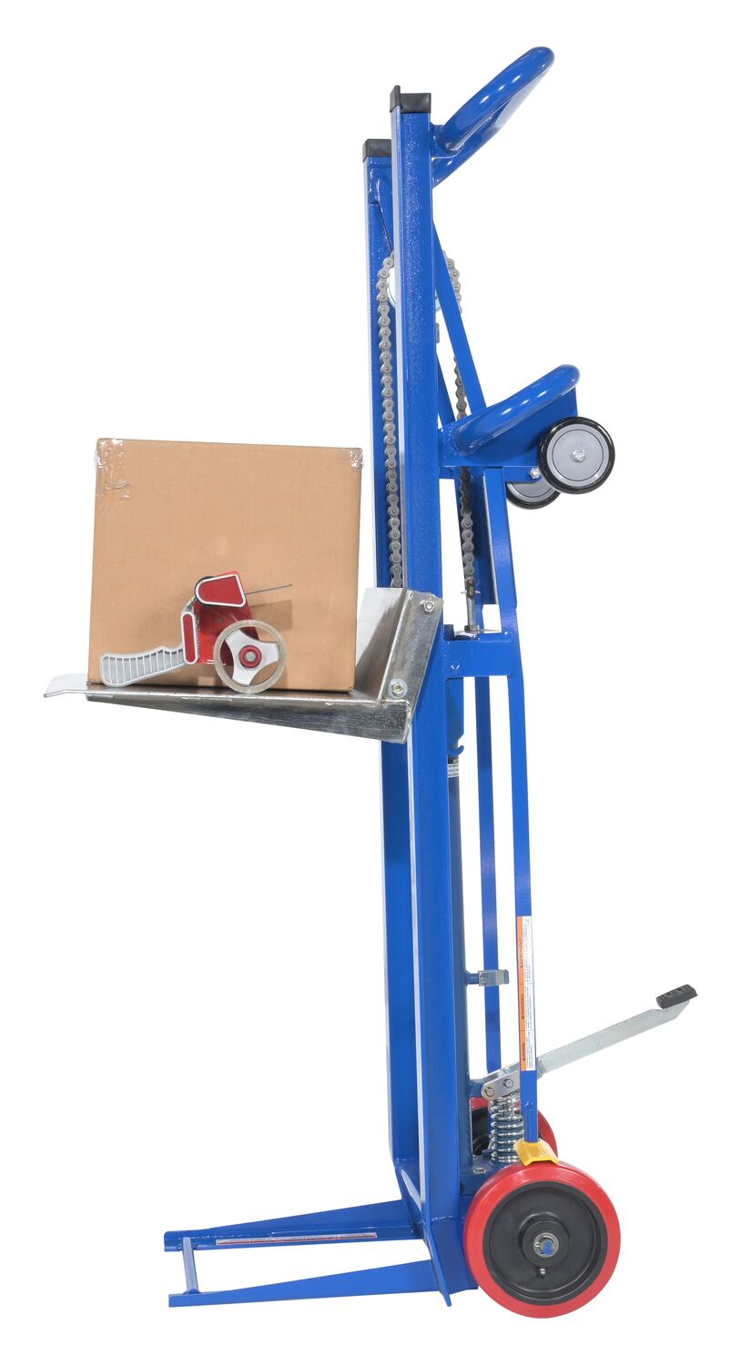 Transport loads in the lowered position and maneuver work materials to an ergonomic height. Ideal in compact work areas. Safe and easy one person handling of loads up to 1,000 lbs. An efficient way to unload heavy objects from semi trailers. Rugged steel construction for years of service. Dependable precision built hydraulic system is activated by easy action foot lever. Additional rollers on the handle make loading into a delivery truck easy. Steel construction. Approximately 1" of lift per pump. Models HYDRA-2 & HYDRA-4 come standard with a single wheel brake. HYDRA-HD has (2) two swivel casters with brakes. Baked-in powder coat finish for toughness.