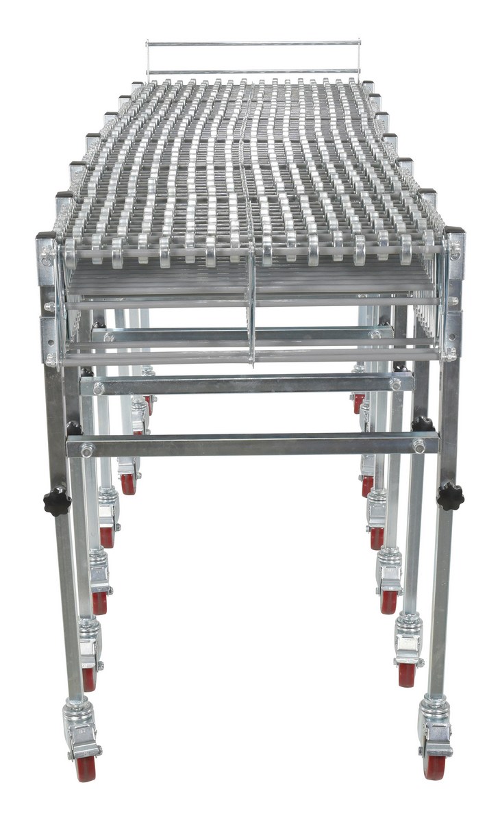 Expandable Roller Conveyor is the perfect asset for packaging and distributing facilities. The conveyor provides the user an ergonomically friendly way to transfer goods while minimizing the bending and twisting during shipping and handling. A strong construction provides strength for transferring large awkward products. The conveyor can be expanded to reach greater distances between packaging points. Once finished it can be retracted to fit in a condensed area.