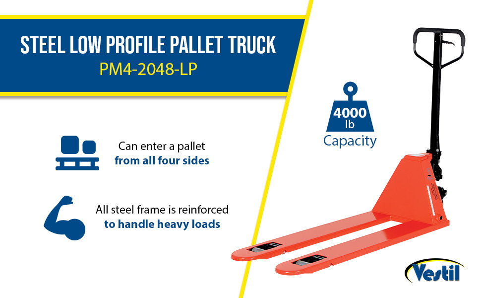 The Low Profile Pallet Truck enters pallets from all four sides. All steel frame is reinforced to handle 4,000 lb. capacity loads. Individual fork width is 7" wide. Wide loop control handle with lift, neutral, and lower functions provides fingertip control. Lifetime lubricated bearings. Hydraulic system has hard chrome plated pump piston with polyurethane seals. Suspension system has a heavy-duty thrust bearing. Complete with adjustable push rods, polyurethane wheels, steel load rollers and red baked-in powder-coated toughness.
