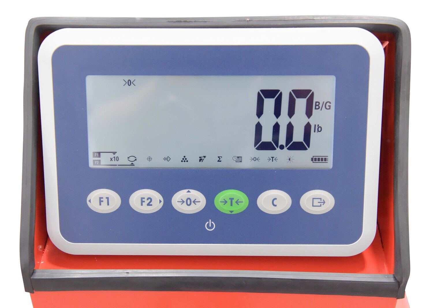 The Pallet Truck with Digital Scale allows you to weigh your load on the spot for maximum efficiency. The frame uses heavy-duty steel construction for maximum strength and durability. This model is very user friendly and is suitable for low height lifting. The built-in scale allows you to weigh your load as you are handling it. The scale is selectable in a variety of increments to adjust to the size of your load. It has keyboard calibration and functional setup with automatic zero capabilities. Digital filtering is used to help compensate for vibration and motion to make the Pallet Truck with Digital Scale smooth and accurate. Scale accuracy is +/-0.1% of the applied load. Forks are 7" wide each. Factory calibrated for shipping destination. AC adaptor included. Powered by 6 AA batteries. (Four (4) AA batteries included in units PM-2048-SCL-LP-SS and PM-2748-SCL-LP-SS). Models ending with "E" are economy models. Those skus have a scale powered by (1) one 6V battery.