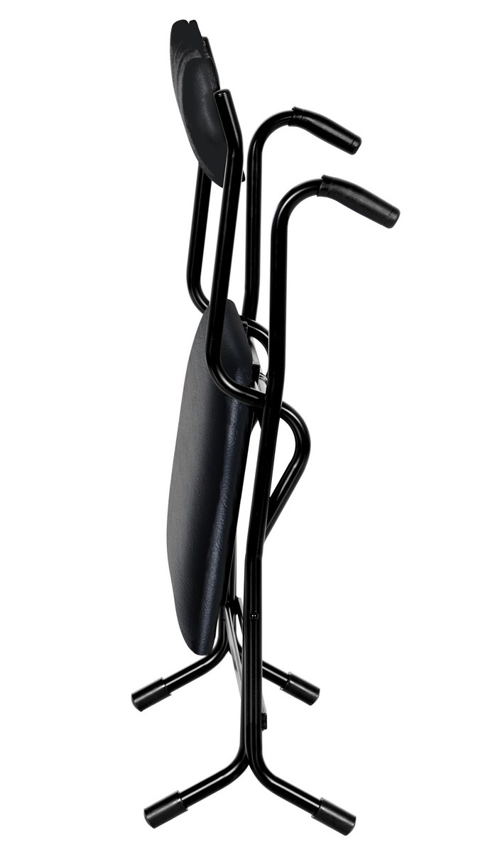 The folding arm chair is ideal for a variety of industrial environments. The lightweight steel construction with a powder coat finish is durable and easily moved from area to area. The unique folding design features an integral arm support system that offers assistance while transitioning from a sitting to standing position. To fold, simply push the front of the seat up and back, while the unit collapses onto itself. The unit includes vinyl cushioning for comfort, plastic caps on the steel legs to protect against floor damage, and is self-standing when folded for areas of limited storage space. Color is black.