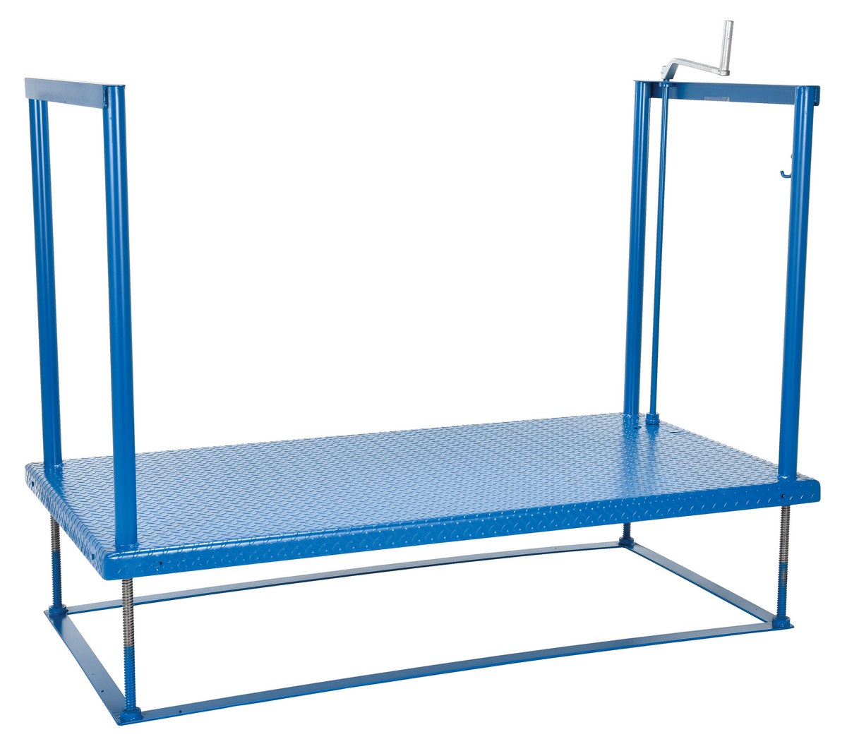The Posi-Crank incorporates the use of acme threaded rods and a series of gears for simple yet effective height adjustment. A heavy duty chain is used in lieu of a belt to ensure a positive working height without risk of slippage. The crank handle may be removed and placed on the handle holder for maximizing the operating space. The deck is constructed of 1/8" steel tread plate for strength and the best traction. Maximum capacity is 500 pounds. Vertical travel range is 3" lowered to 19" raised. The Posi-Crank is constructed of steel to provide for years of service. The unit is painted blue, while the ergonomic anti-fatigue matting is also blue.