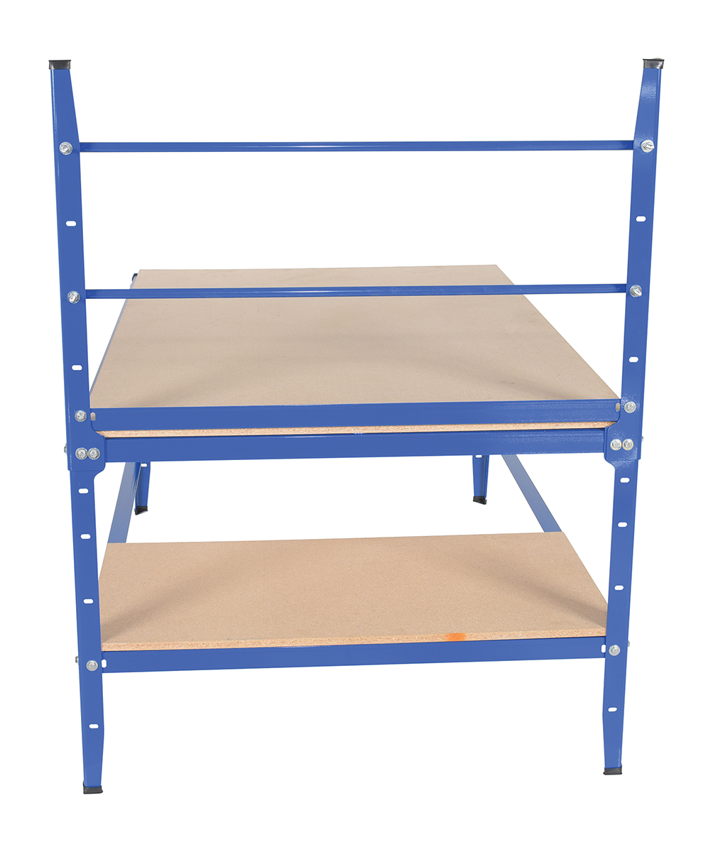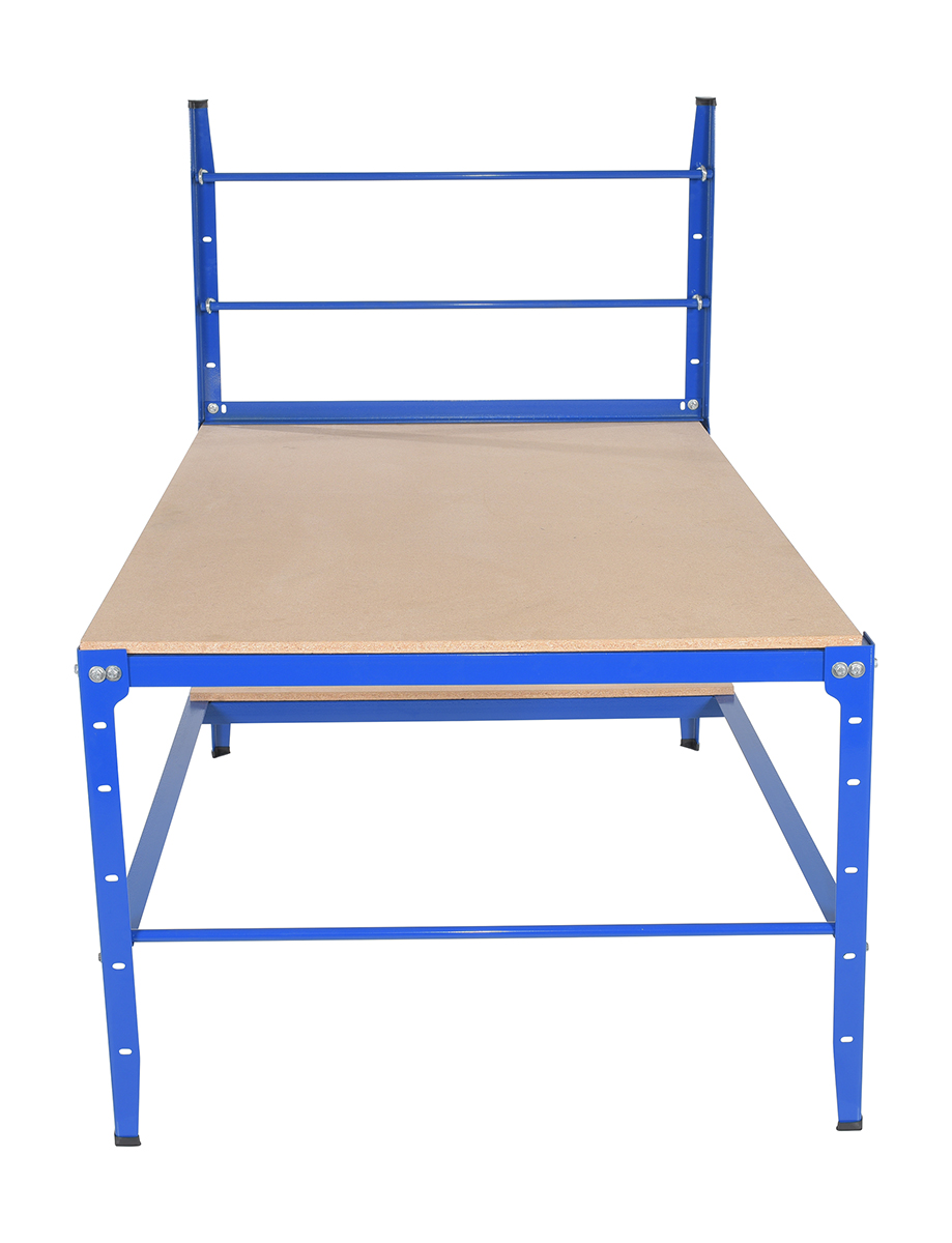 Multi-purpose work bench is great for all your packaging needs! Wooden surface is durable and soft so it will not damage your products. Includes elevated tower for holding two rolls of packaging paper or bubble wrap. Maximum roll width is 44". Maximum roll diameter is 20". Height of the three roll axles are 57-5/8", 45-5/8" and 13-7/8", adjustable in 6" incremetns. Extra roll of material may be stored under table. Lower storage shelf for holding boxes, tape, tools and other items. Steel construction with blue painted finish. Wood Particle Board top is 3/4 (in.) thick. Table top capacity 500 lbs.,shelf capacity 250 lbs., and Cross Bar Capacity 250 lbs. each.