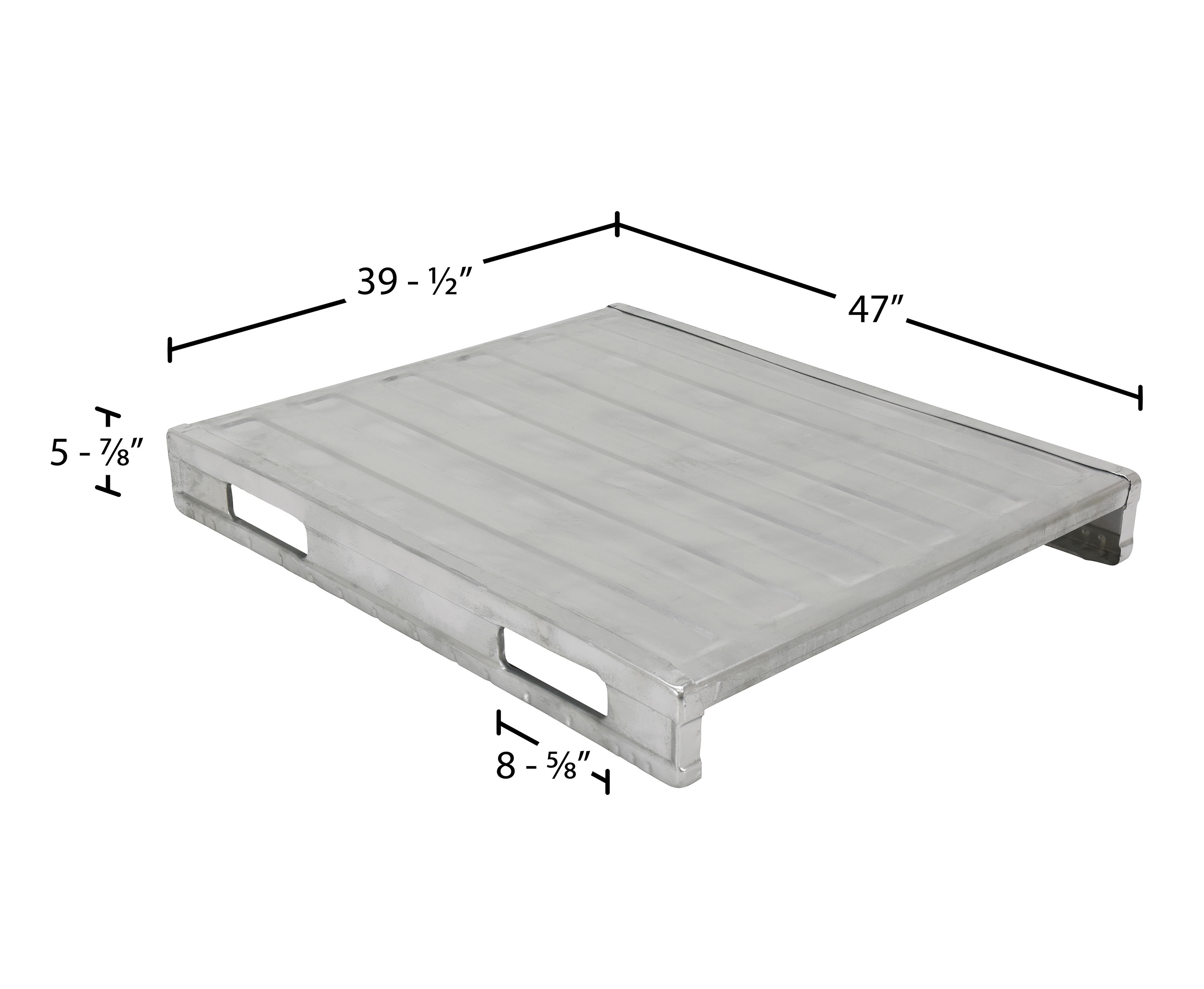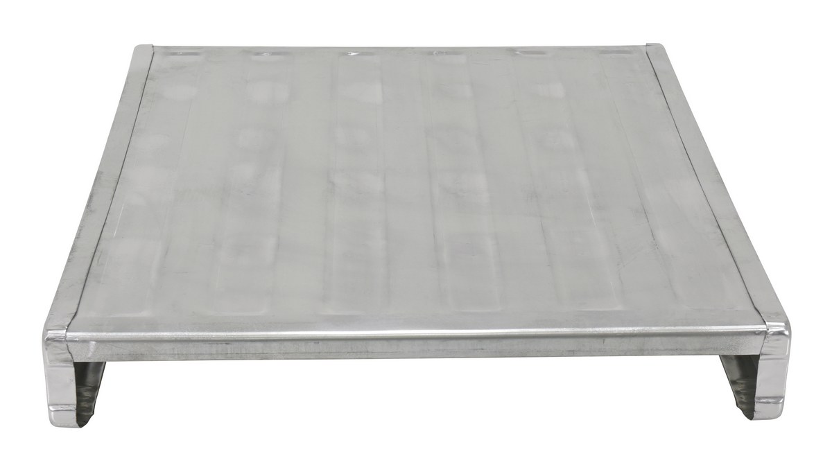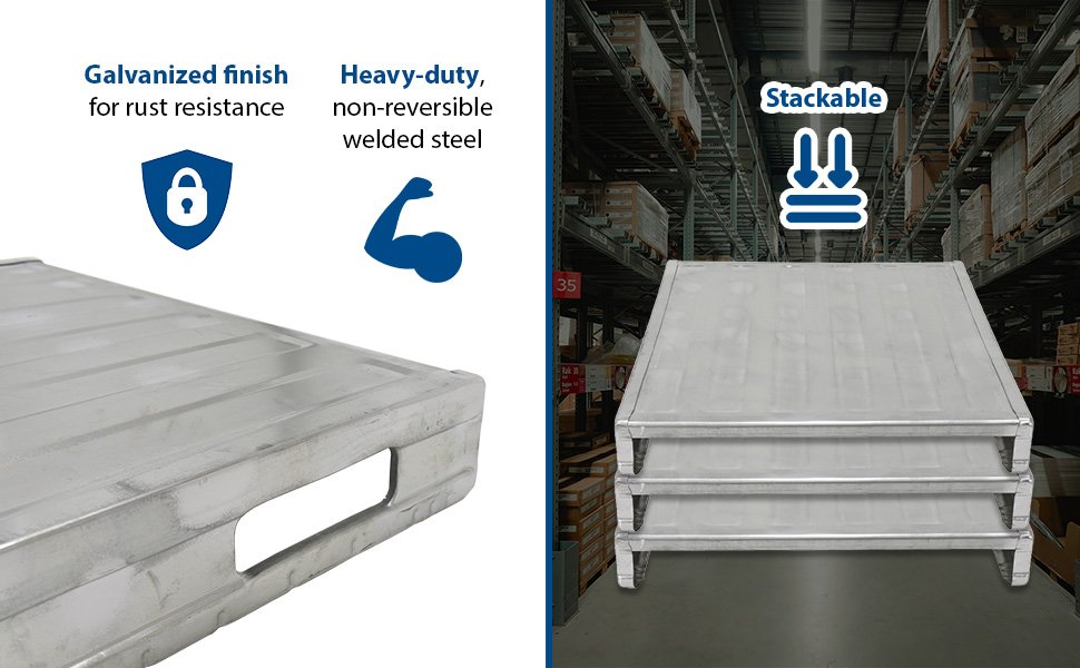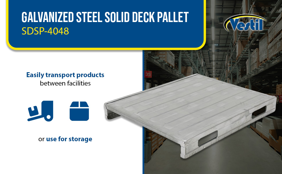 The heavy-duty non-reversible welded steel Solid Deck Pallet are ideal to transport and store products within your facility and/or to transport them between facilities. Galvanized finish for rust resistance. Usable fork pockets are 8-1/2"W x 2-1/2"H. Open end usable size is 35"W x 3-3/4"H.