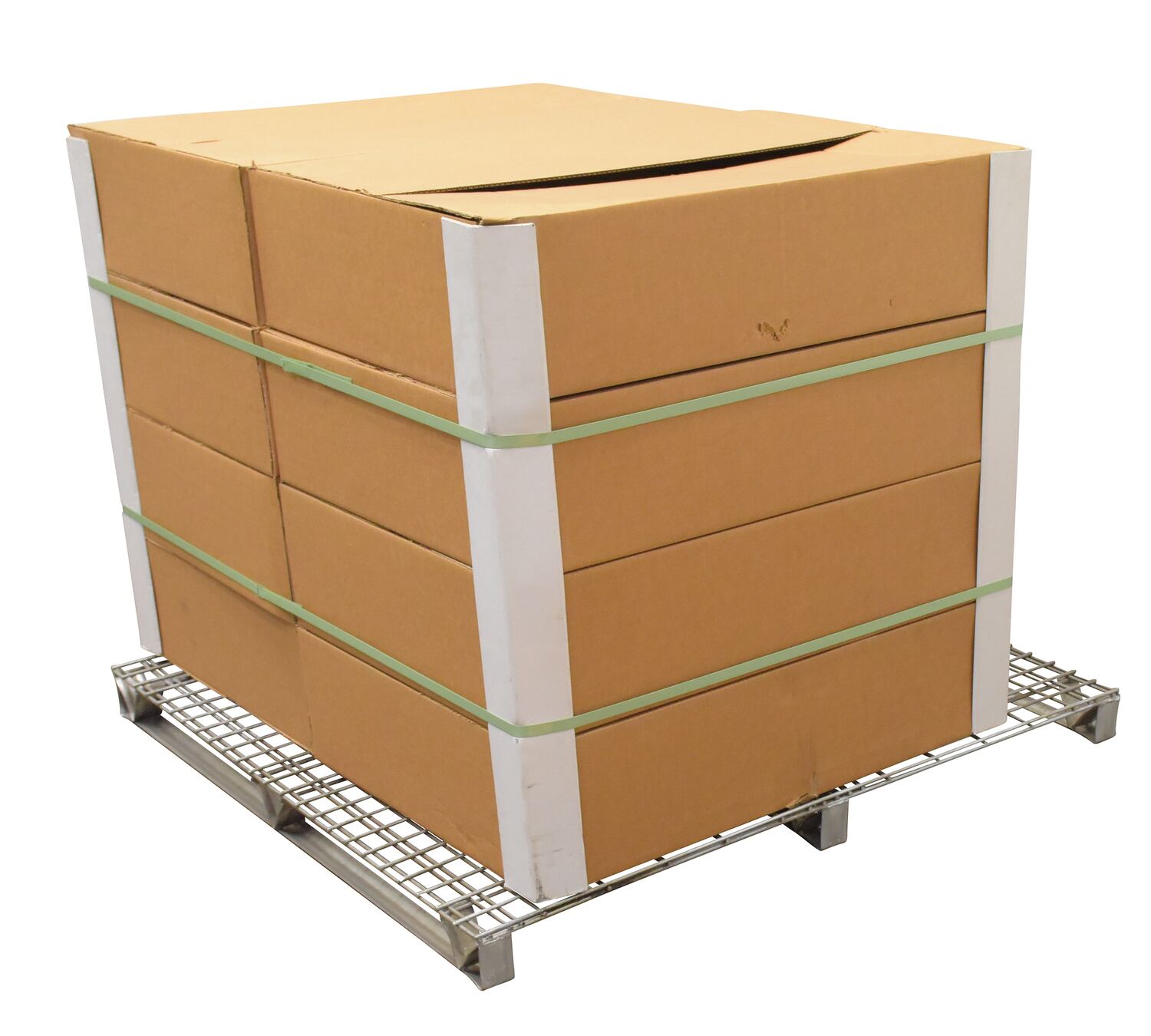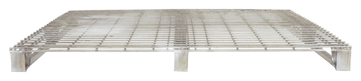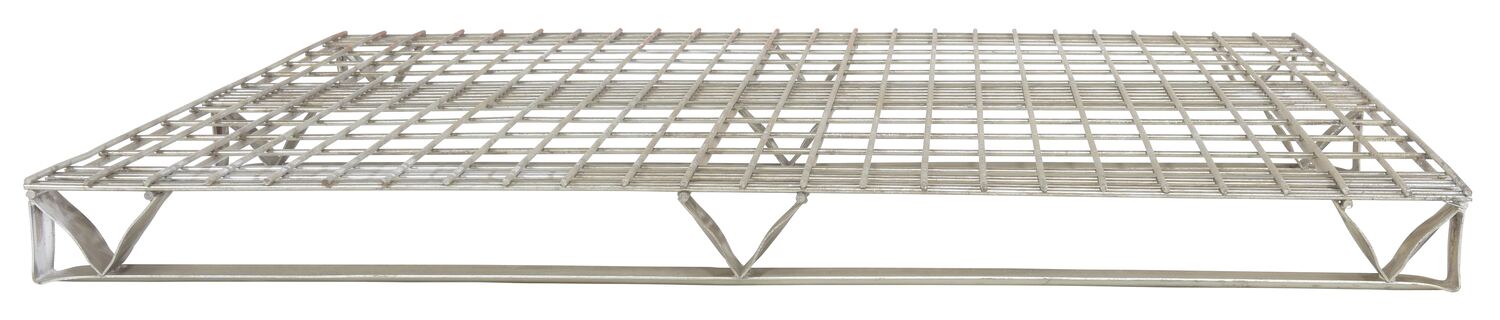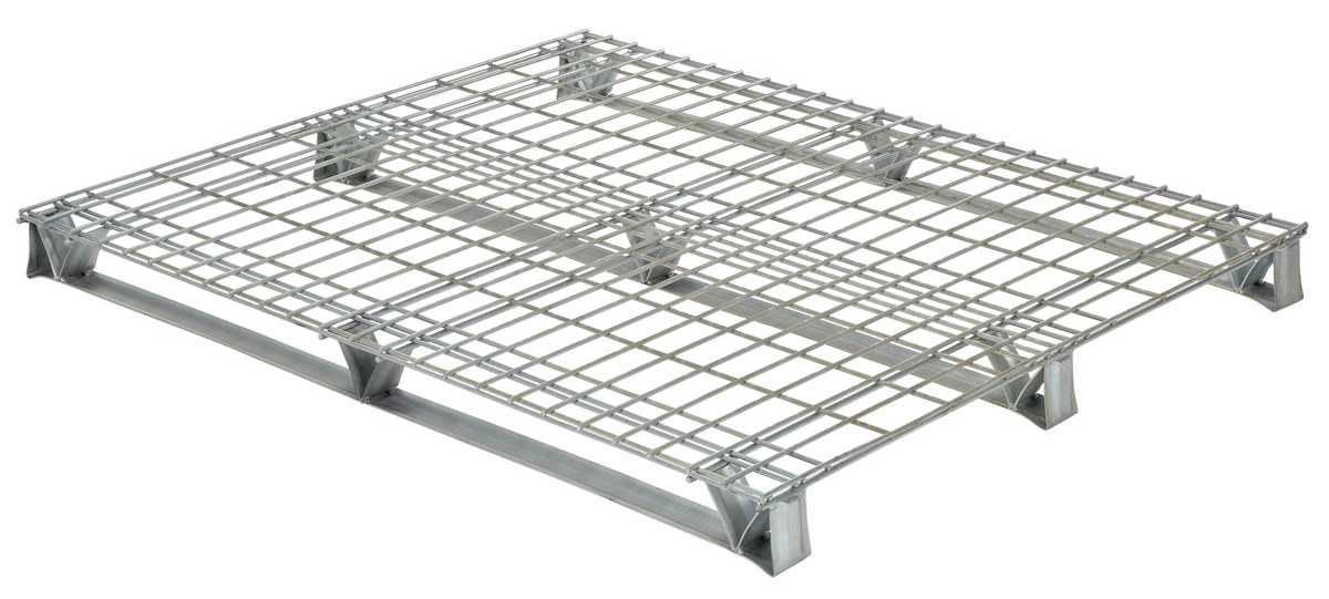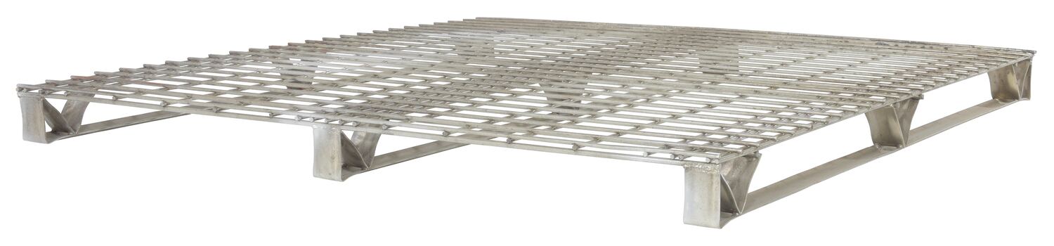 Galvanized Welded Wire Pallets will stand up to heavy-duty use. Design allows for stacking. Four-way access with pallet truck and fork trucks. Open decking features 2" x 4" grid pattern. Usable height on open end is 3". Usable eight on stringer end is 2-3/4". Understructure supports are made from 12 gauge steel. Decking is made from welded steel wire. Welded steel construction with galvanized finish.