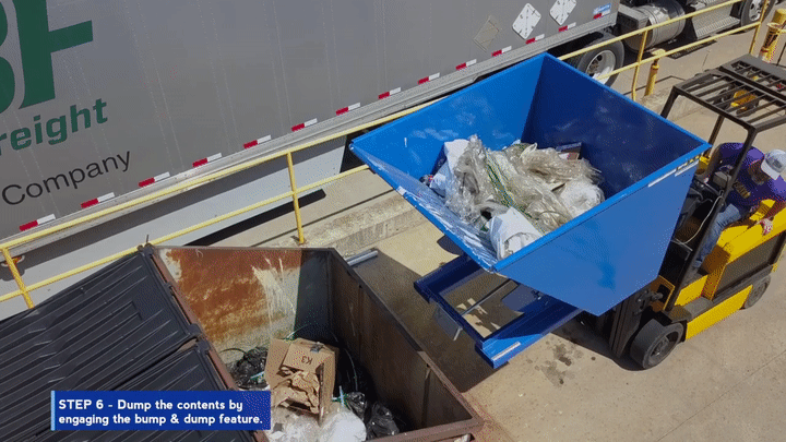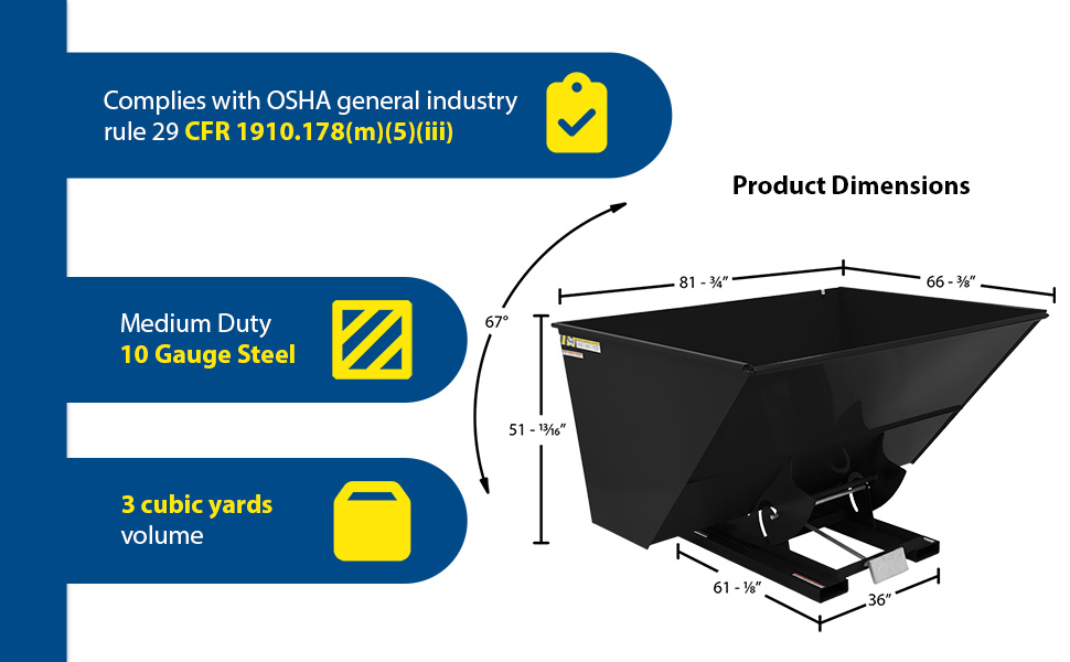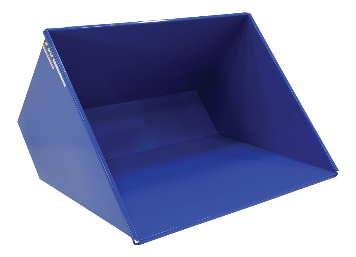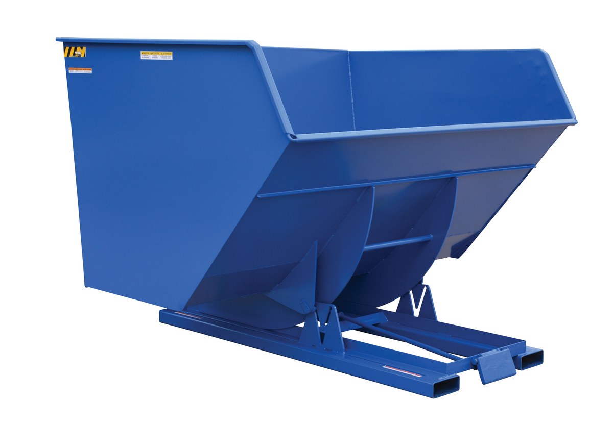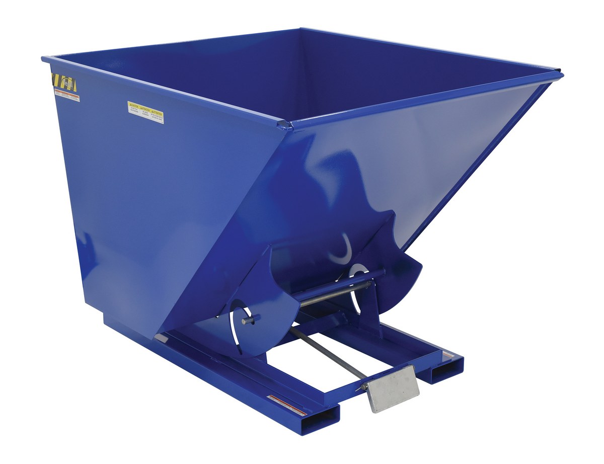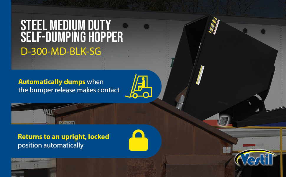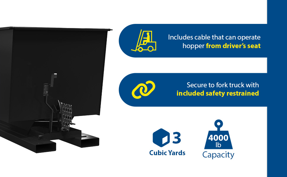 Hopper automatically dumps when bumper release contacts the front of the dumpster. Hopper returns to an upright and locked position automatically after it dumps. Also includes a cable that may be operated from the seat of the fork truck to manually dump the hopper. A safety restraint is provided to secure the hopper to the fork truck. Usable fork pockets are 7-1/2"W x 2-1/2"H. Self-dumping hoppers facilitate compliance with OSHA General Industry rule 29 CFR 1910.178(m)(5)(iii) by allowing lift truck operators to remain at the controls of their truck throughout the dumping process. Optional leak proof design sold separately. D-25, D-33, D-50, D-75, and D-100 are stackable if you stack the top hopper turned 90 degrees from the bottom. Blue baked-in powder-coated toughness is standard.