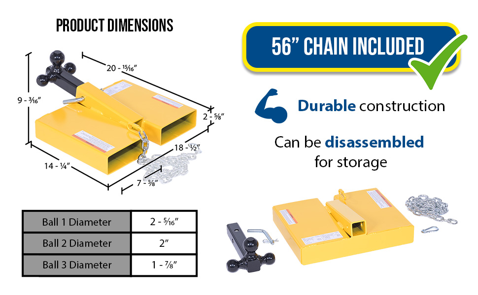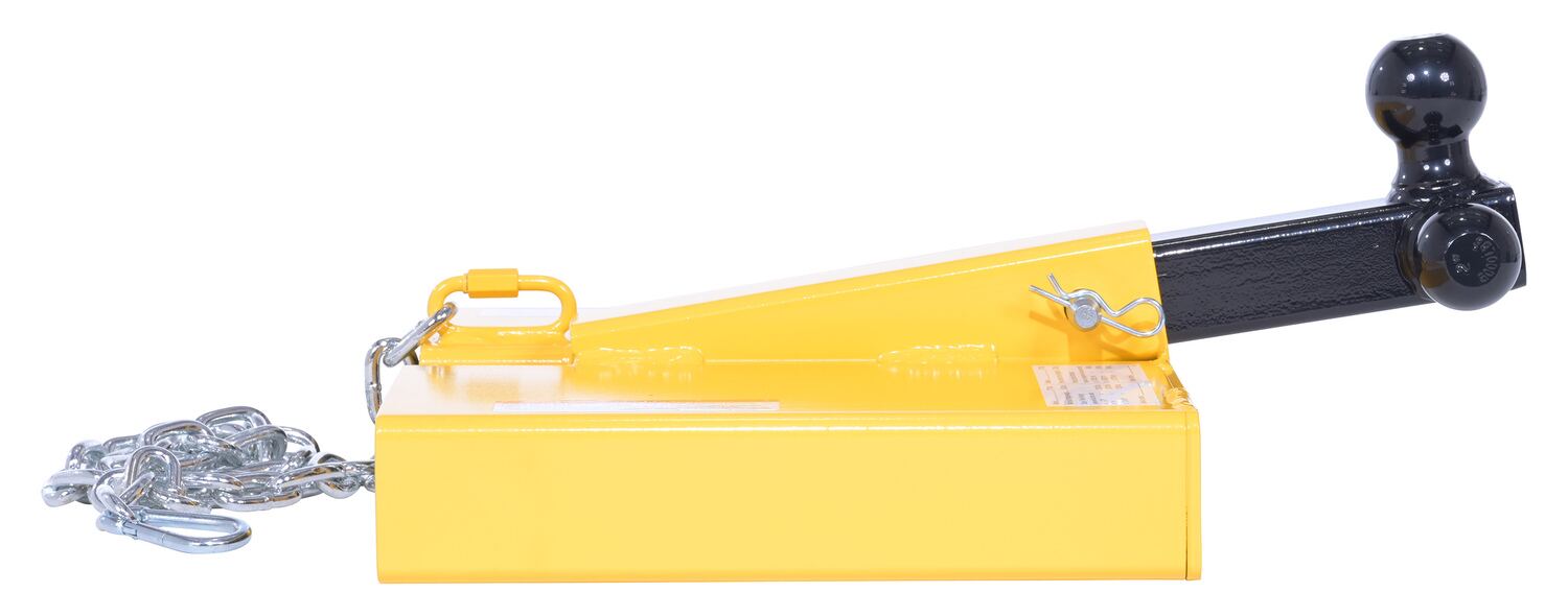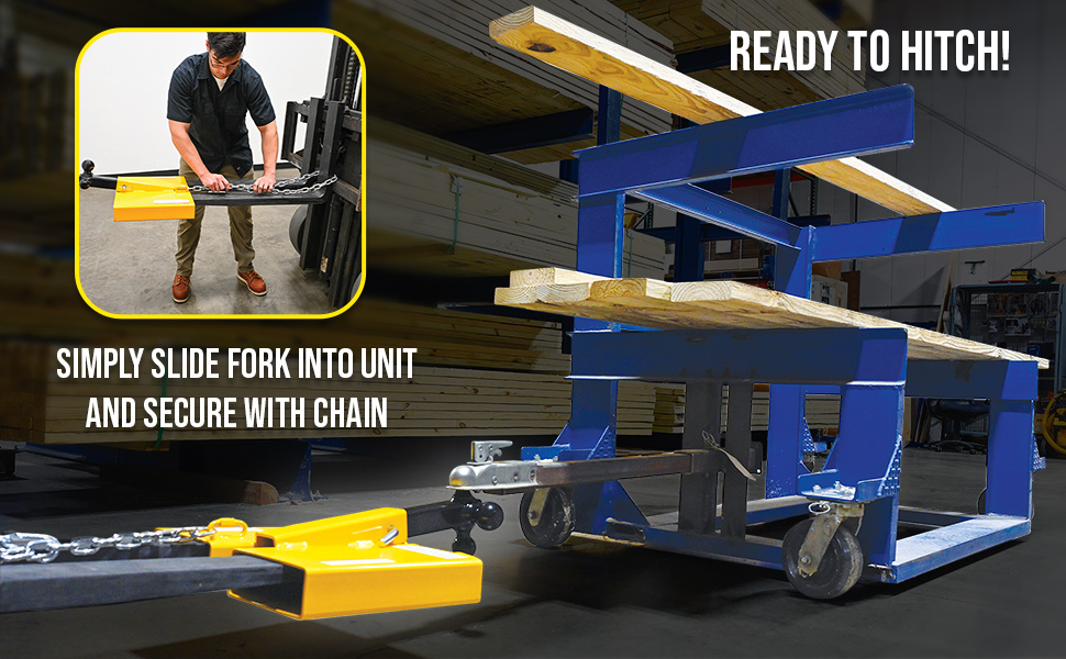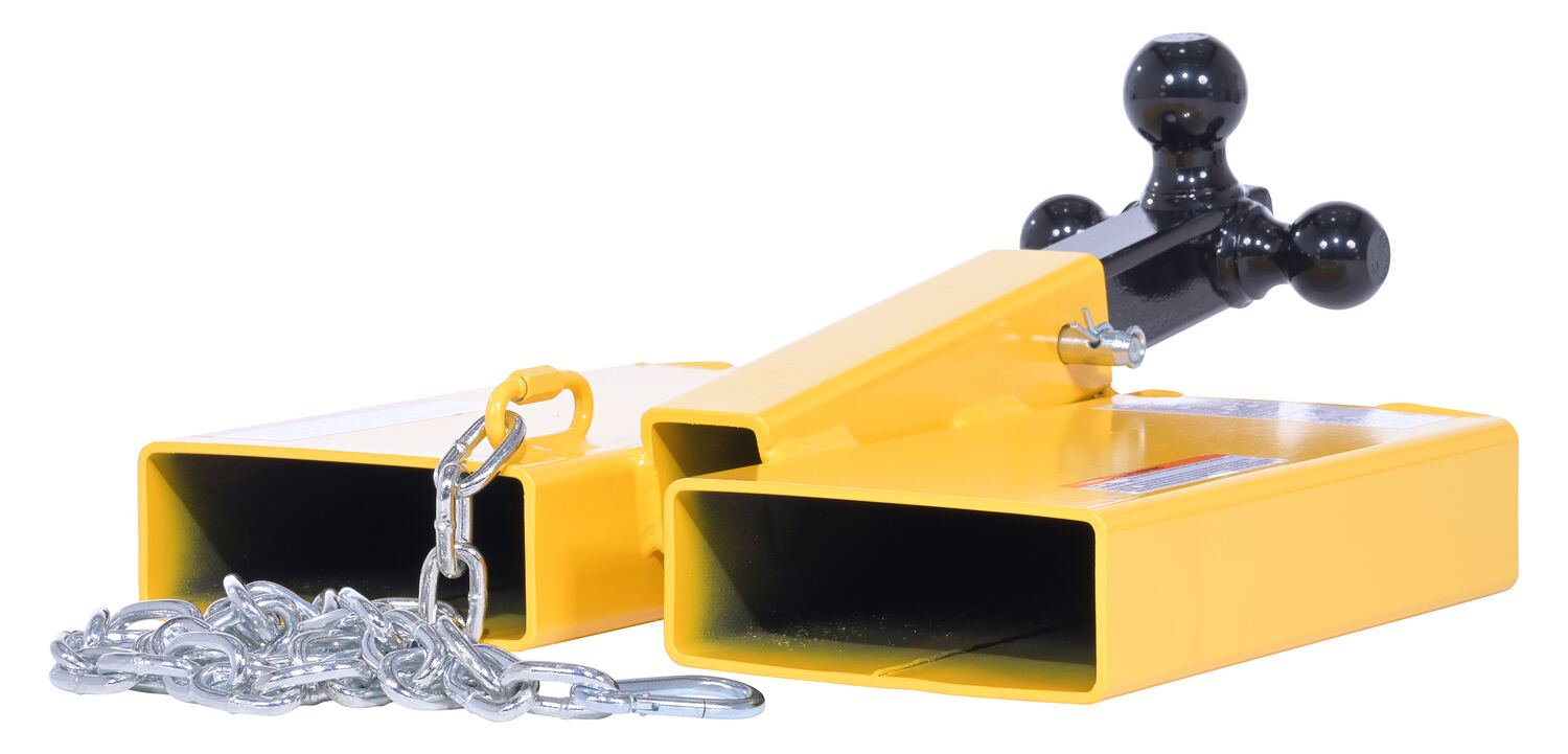 The Fork Lift Hitch is a superb addition to most manufacturing and maintenance facilities. Strong steel construction allows for long term use, even in the harshest of conditions. The hitch includes a yellow finish for clear visibility. To use slide the fork lift forks in to the unit and secure safety chain to fork lift. Once in place, the unit is ready to be hitched to the desired equipment. Includes 56" long chain to secure to fork lift.