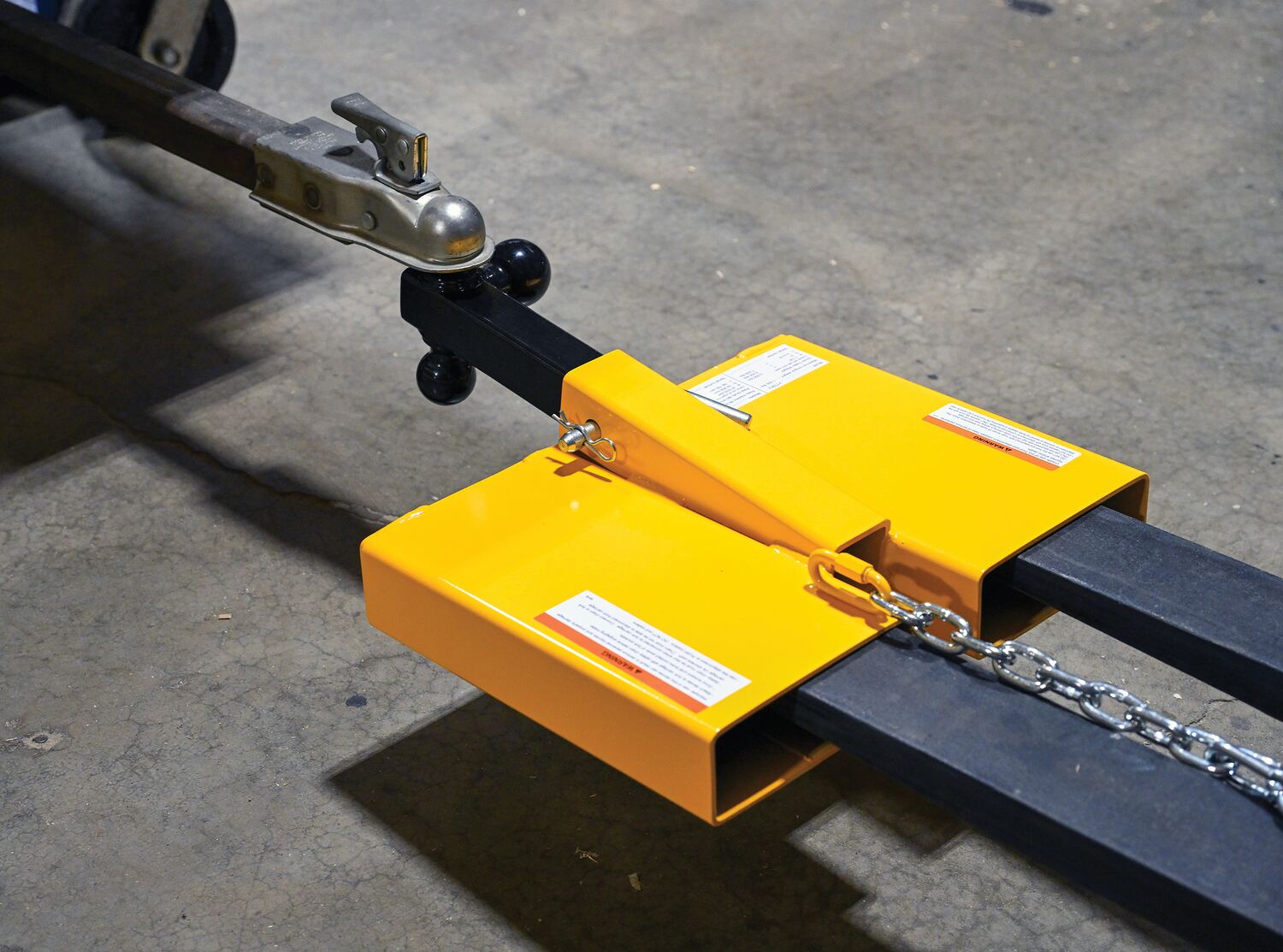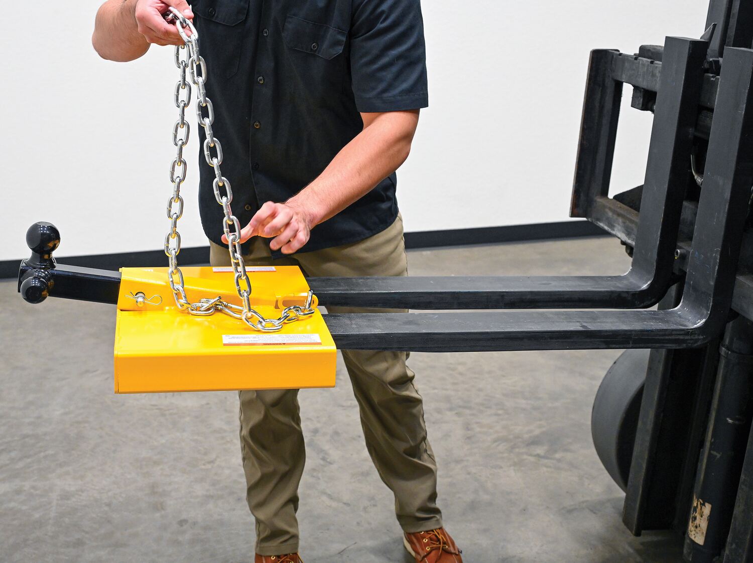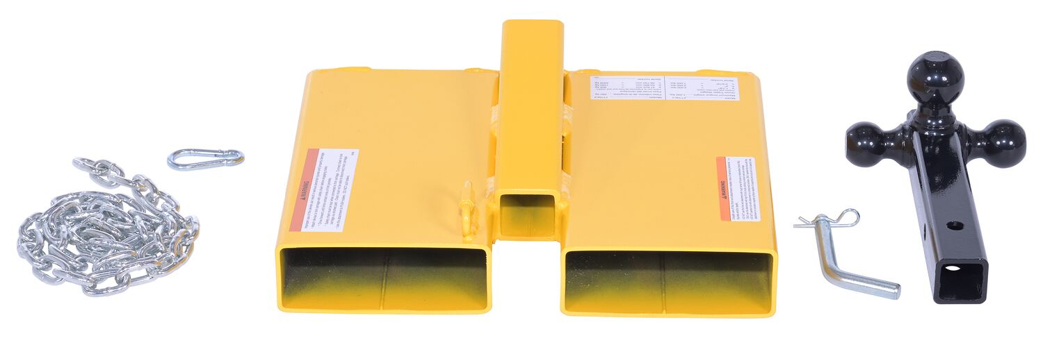 The Fork Lift Hitch is a superb addition to most manufacturing and maintenance facilities. Strong steel construction allows for long term use, even in the harshest of conditions. The hitch includes a yellow finish for clear visibility. To use slide the fork lift forks in to the unit and secure safety chain to fork lift. Once in place, the unit is ready to be hitched to the desired equipment. Includes 56" long chain to secure to fork lift.