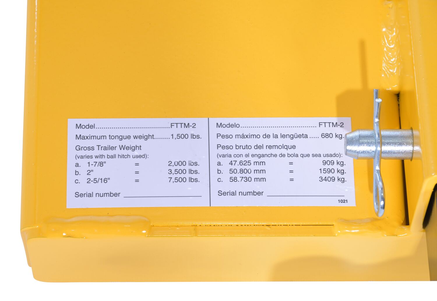 FTTM-2 FTTM-2Steel Fork Lift Hitch Attachment 20-15/16 In x 18-1/2 In x 9-3/16 In 1500 Lb. Capacity YellowMaximum Tongue Load (lb.): 1,500