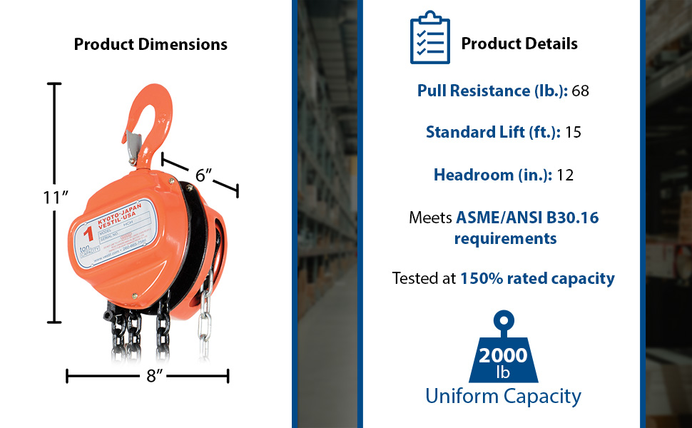 | Steel Manual Chain Hoist 10 Ft. Lift 2,000 Lb. Capacity Orange | Uniform Capacity (lb.): 2,000 Standard Lift (ft.): 10 | 26 |